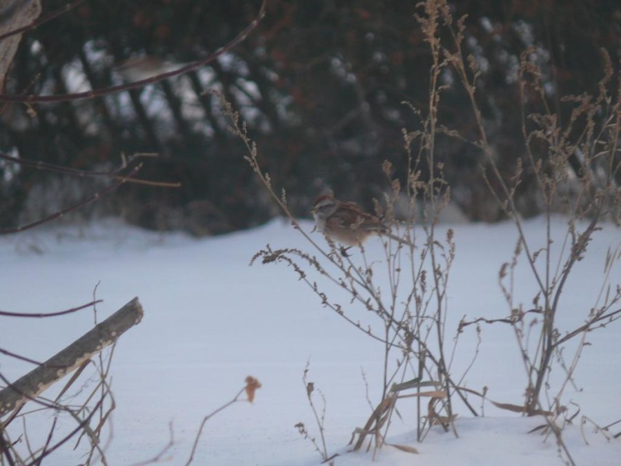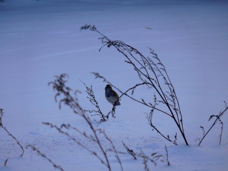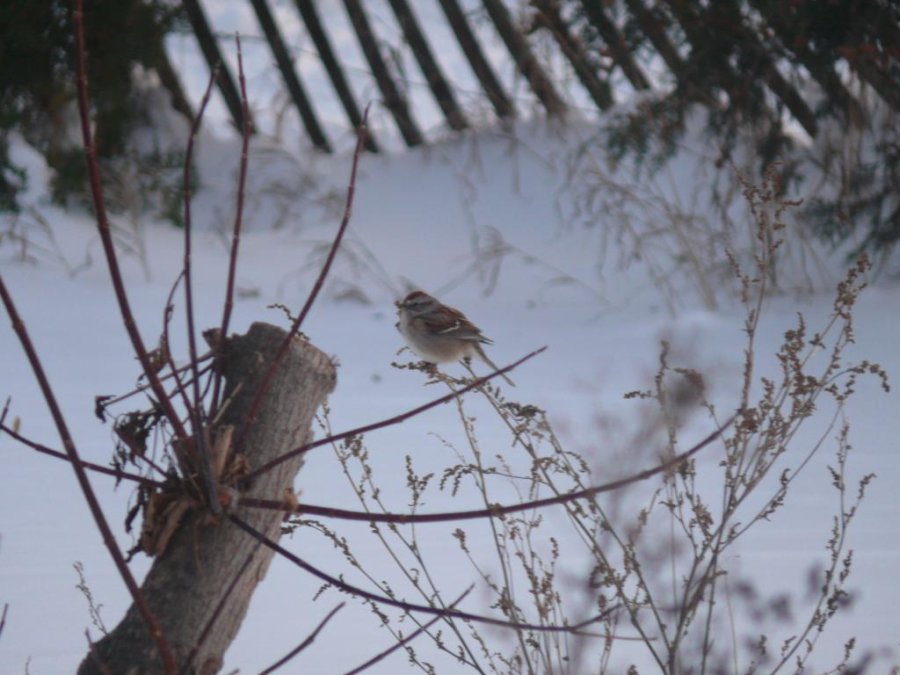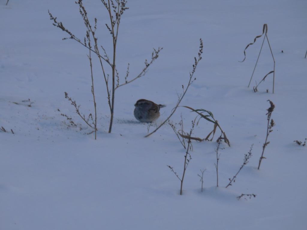 Le marais devant chez moi est gelé. Des rats musquées ont commencés à faire leurs huttes dans des zones de marais, les oies sont encore là ainsi que quelques garrots à œil d’or. Des bruants hudsoniens, peu farouches, animent les abords de la maison. Je prépare les raquettes pour aller faire de la photo sous peu.