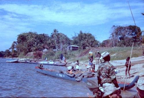 La remontée du Maroni et de l’Inini se passa sans problèmes et nous nous enfoncions chaque jour un peu plus dans des terres sauvages et vierges à cette époque de toutes traces humaines. On voyait des animaux en quantité, caïmans, jaguars, perroquets, singes, anacondas. Cette rivière maintenant détruite par la chasse, le tourisme et l’orpaillage était à l’époque un riche paradis naturel.