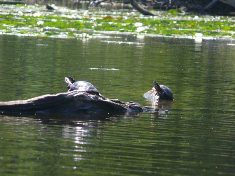 Nous voyons sur un arbre mort trois tortues prendre un bain de soleil.