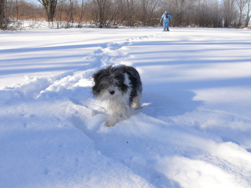 Brillant joue dans la neige et suit les pistes des animaux sauvages avec grand intérêt.