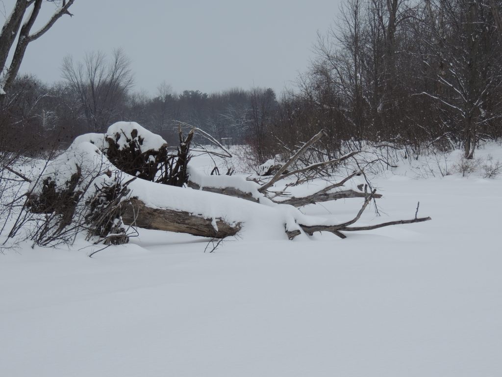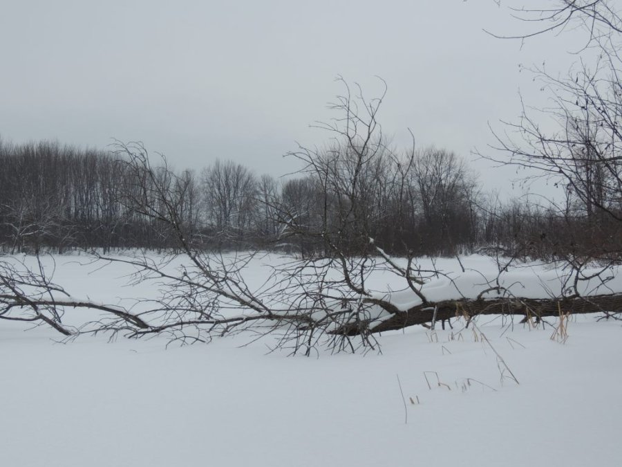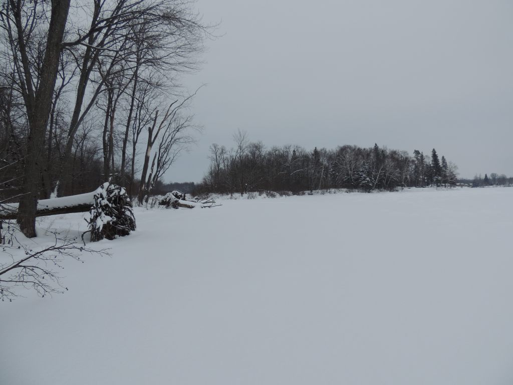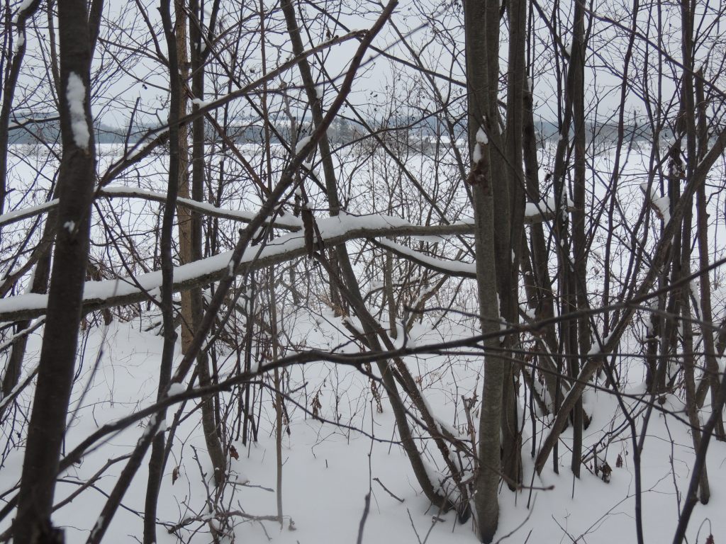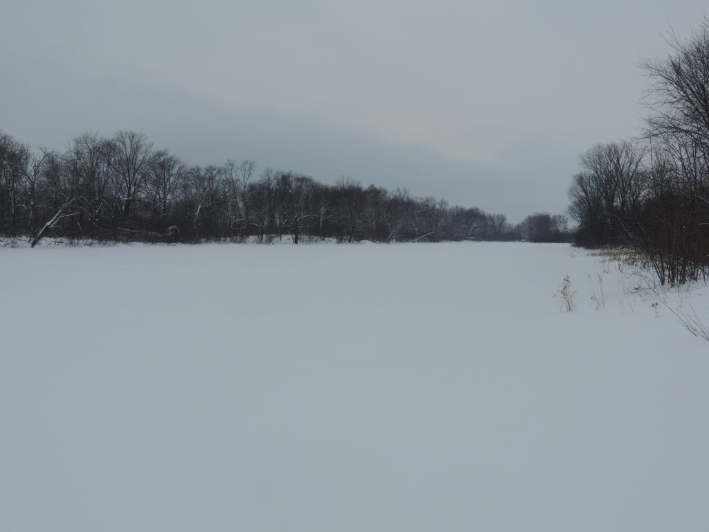 Certaines zones de la rivière dans le lointain ne sont pas gelées et d’autres sont dangereuses à cause des courants qui fragilisent la glace. Je ne les approche jamais.