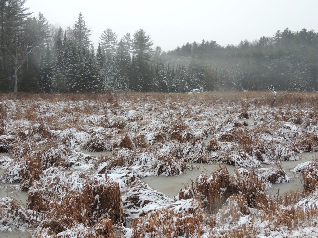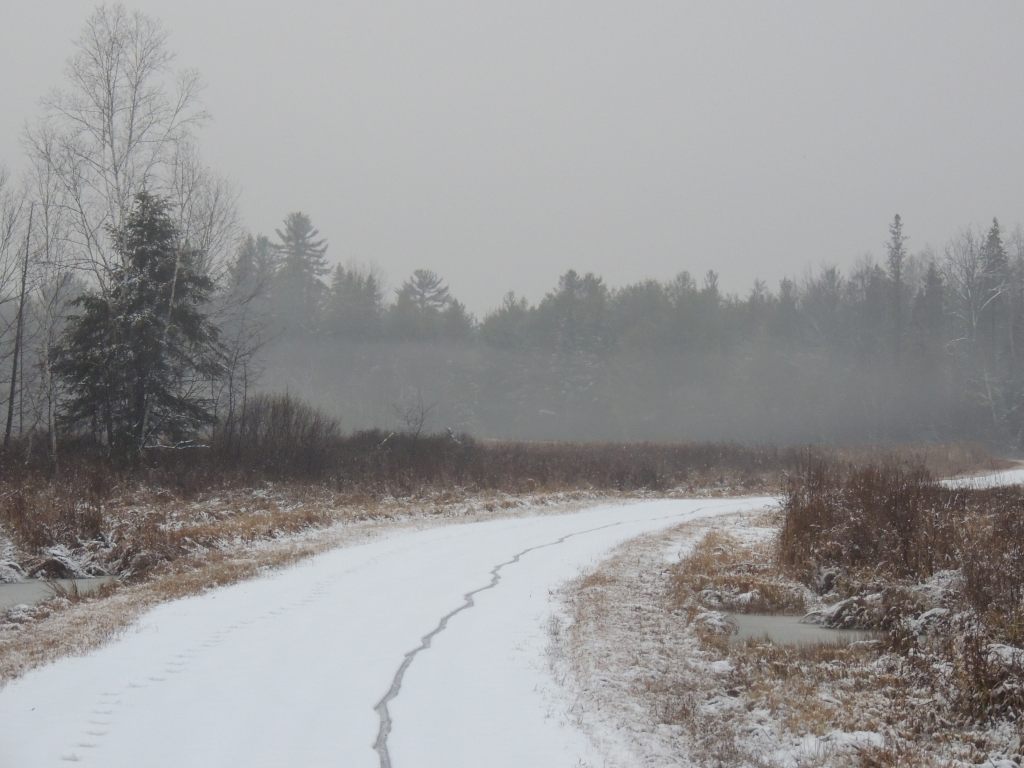 Les arbres, les plantes sont couvertes de neige et au fur à mesure que l’on progresse, la pluie lave les branches les plus fines et tout devient gris, tout deviens sombre.