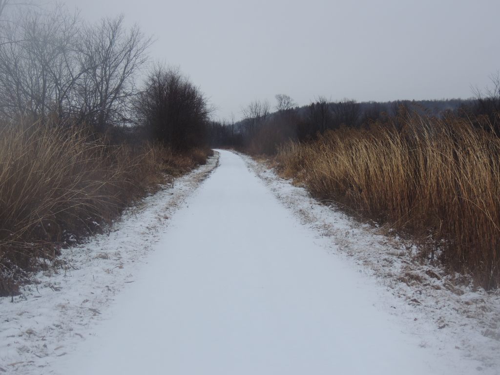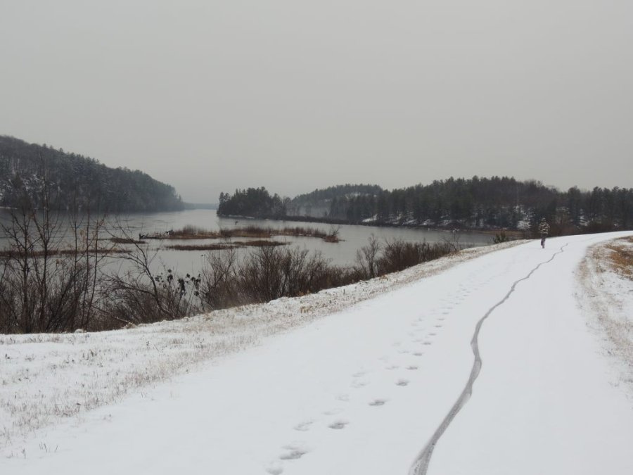 Il fait autour de zéro, entre moins 1 et 1 selon les moments. Il neige fort. Je m’habille vite pour en profiter, mal, j’oublie mes gants, je prend mes chaussures de ville... et je saute sur le vélo. C’est parti pour 12.5 km de vélo en grande partie sur la piste cyclable fréquentée juste par quelques écureuils téméraires d’après les traces observées.