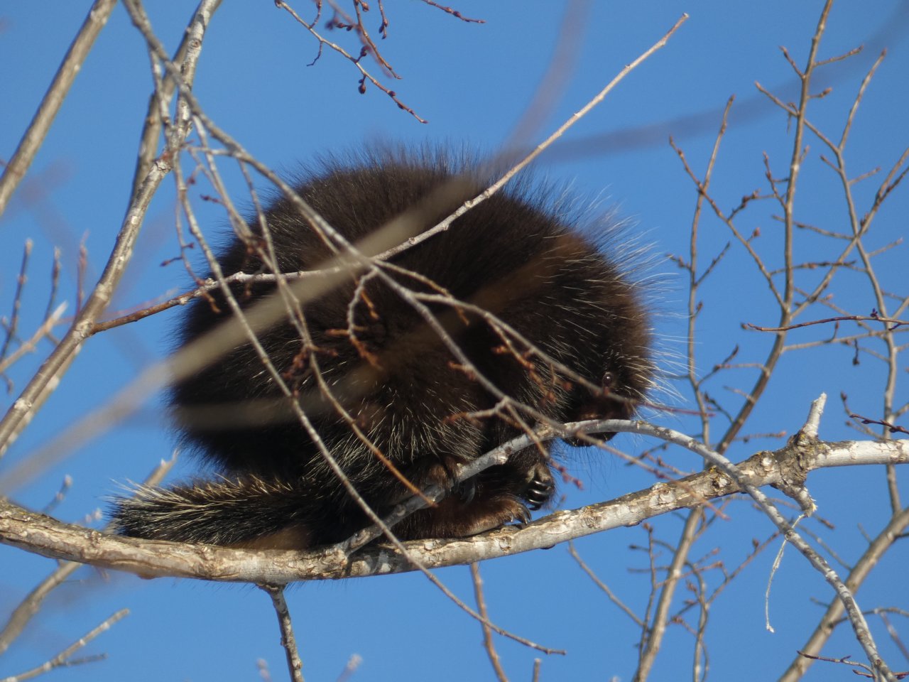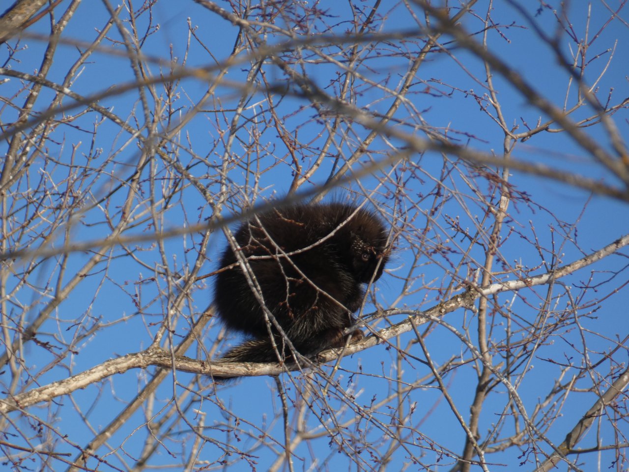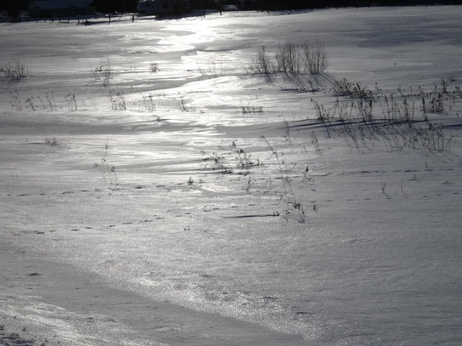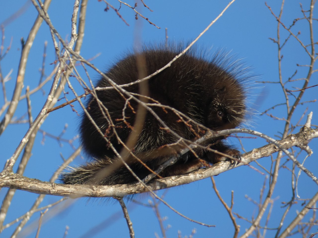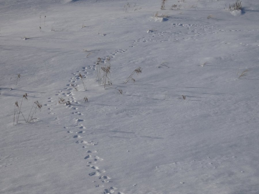Je vois tous les jours ou presque un porc-épic qui de gave de bourgeons ou d’écorces dans un bouquet d’arbres. En dehors de quelques corbeaux, je ne vois rien d’autre sinon de rares traces de lapin, d’écureuils, de loups ou de coyotes. Depuis quelques jours, j’observe aussi les traces d’un renard qui cherche sa pitance avec difficulté. Cette année la neige est très épaisse, de 50 à 80 cm minimum selon les endroits.