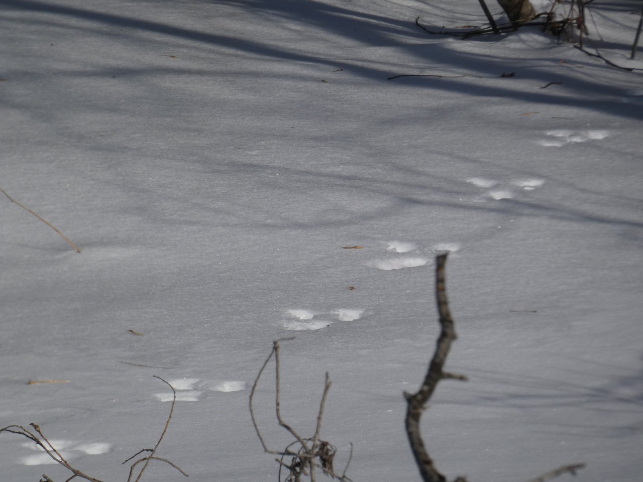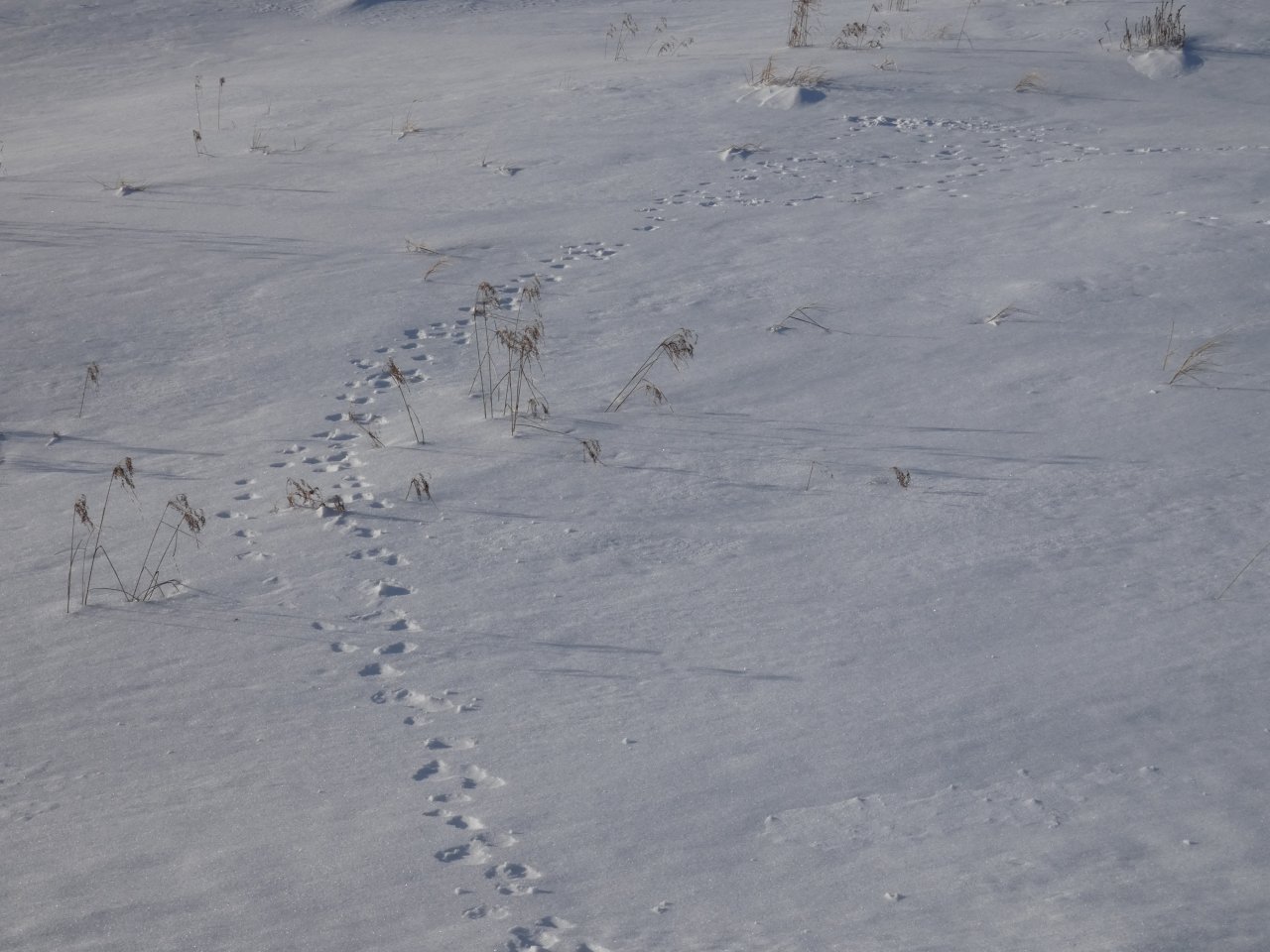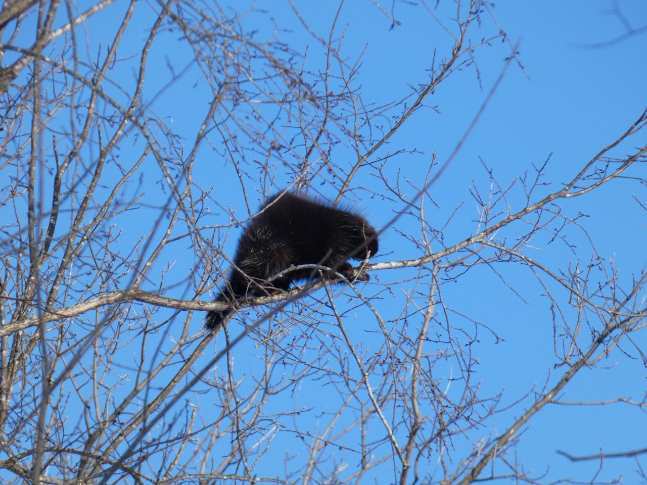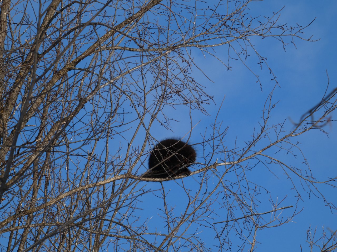 Je vois tous les jours ou presque un porc-épic qui de gave de bourgeons ou d’écorces dans un bouquet d’arbres. En dehors de quelques corbeaux, je ne vois rien d’autre sinon de rares traces de lapin, d’écureuils, de loups ou de coyotes. Depuis quelques jours, j’observe aussi les traces d’un renard qui cherche sa pitance avec difficulté. Cette année la neige est très épaisse, de 50 à 80 cm minimum selon les endroits.