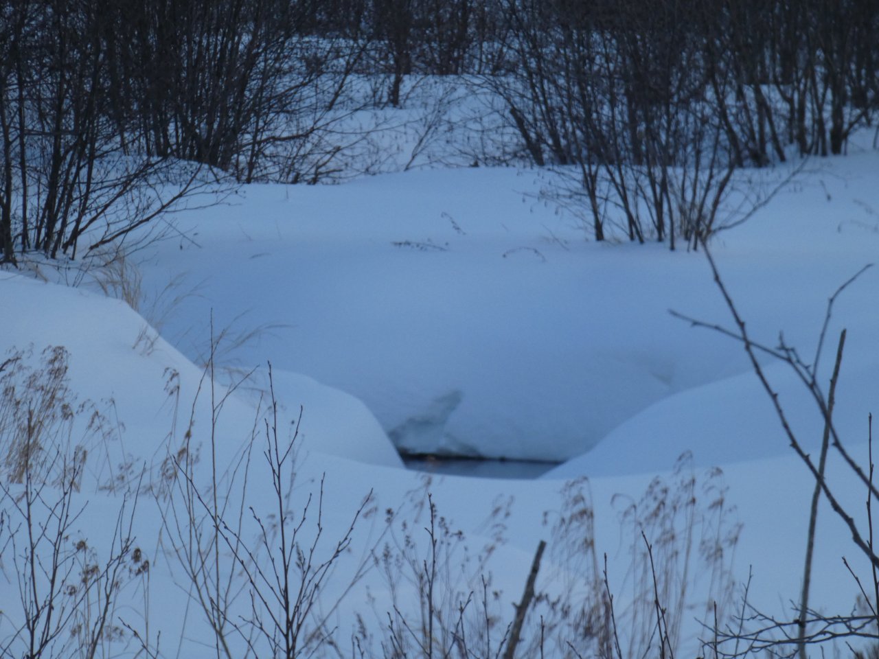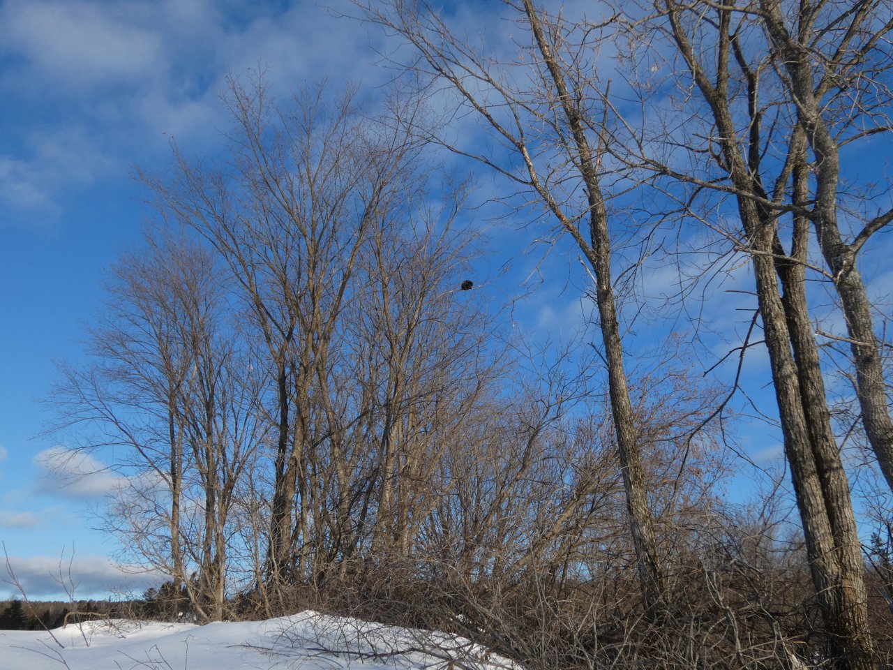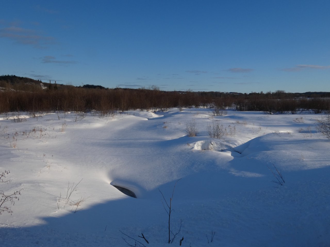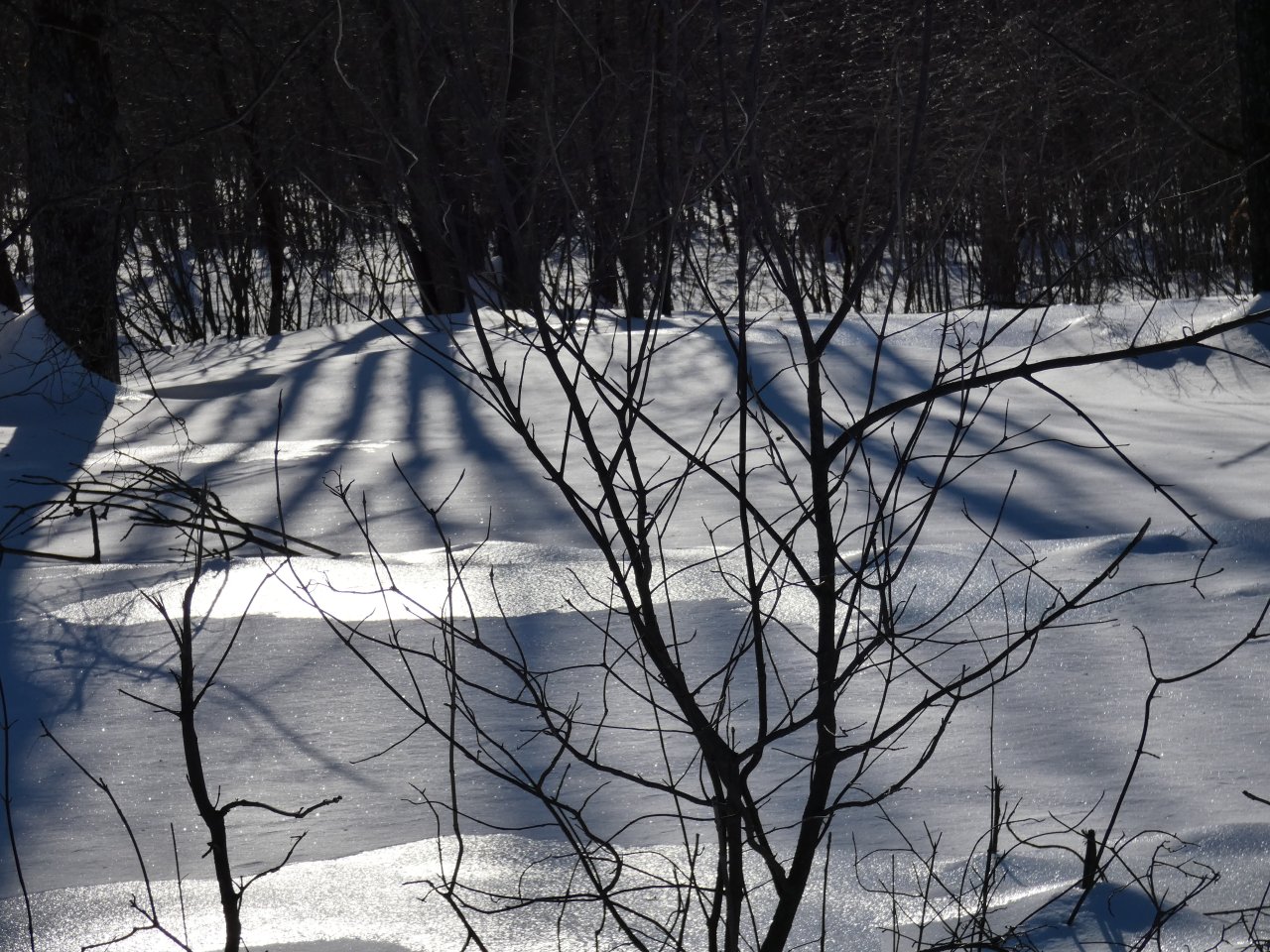 Je vois tous les jours ou presque un porc-épic qui de gave de bourgeons ou d’écorces dans un bouquet d’arbres. En dehors de quelques corbeaux, je ne vois rien d’autre sinon de rares traces de lapin, d’écureuils, de loups ou de coyotes. Depuis quelques jours, j’observe aussi les traces d’un renard qui cherche sa pitance avec difficulté. Cette année la neige est très épaisse, de 50 à 80 cm minimum selon les endroits.