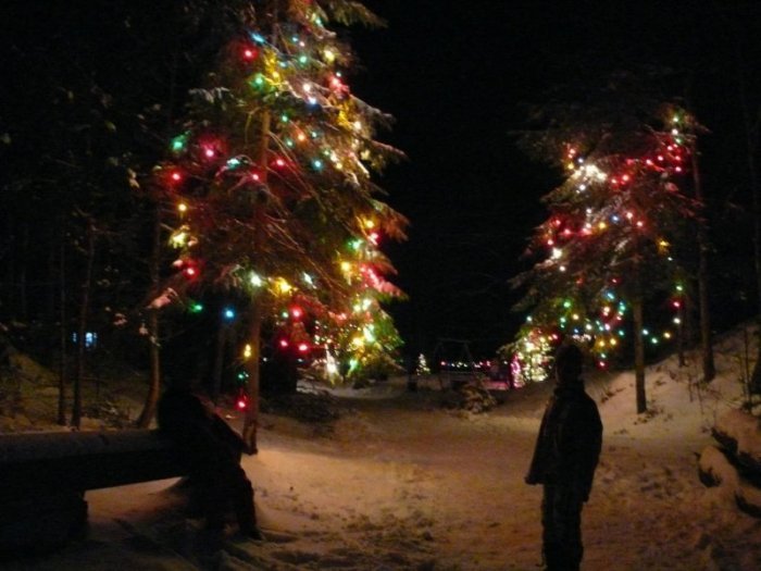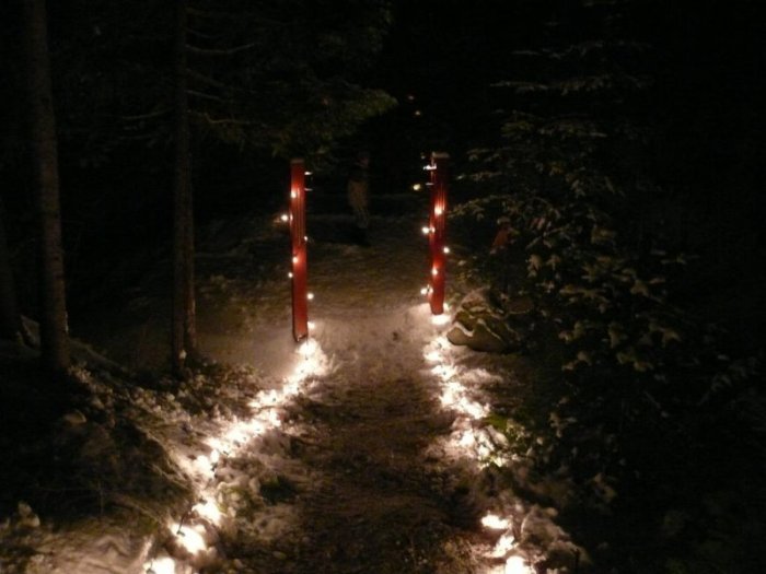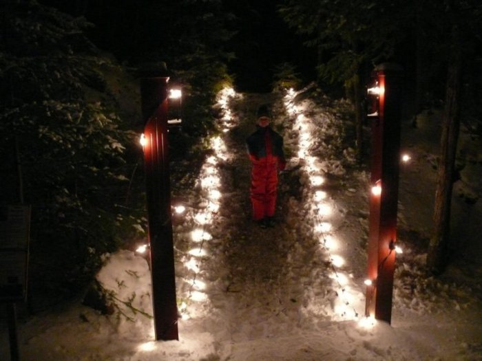 Une petite neige était tombée la veille et malgré un risque de chutes de neige, nous avons décidé d’y aller samedi vers 18 heures. Nous n’avons pas regretté le déplacement. La cabane d’accueil, les barrières en bois, les arbres étaient illuminés et recouverts de guirlandes de Noël et le chemin qui menait au belvédère principal était éclairé de bougies et l’ambiance était féerique.