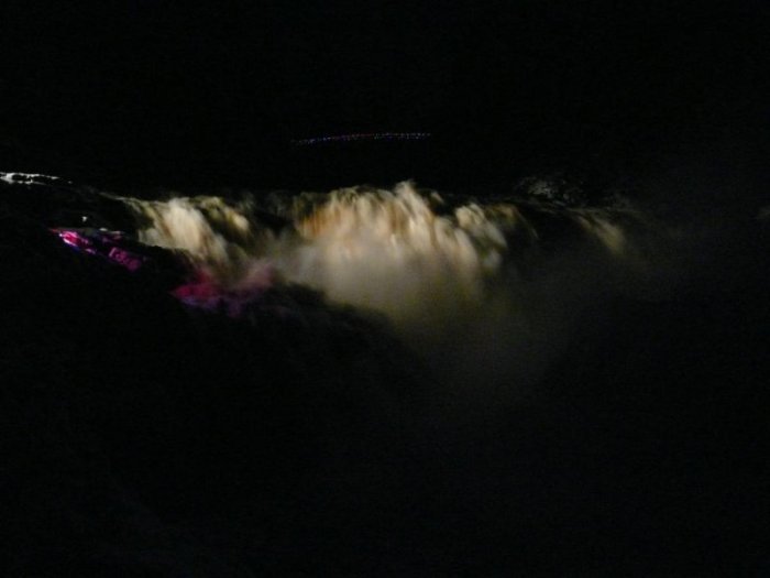 Nous avons vu les chutes puissantes qui dévalaient au milieu de mur de glace en formation et les arbres qui bordaient la chute étaient recouverts d’une gangue de glace qui étincelait sous la lueur blafarde et fantomatique des projecteurs.