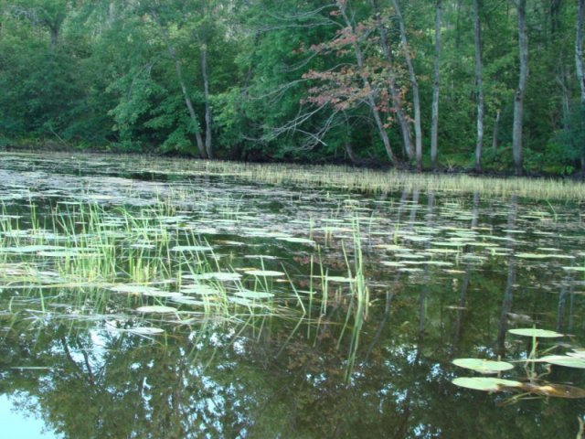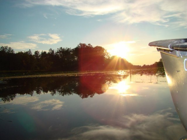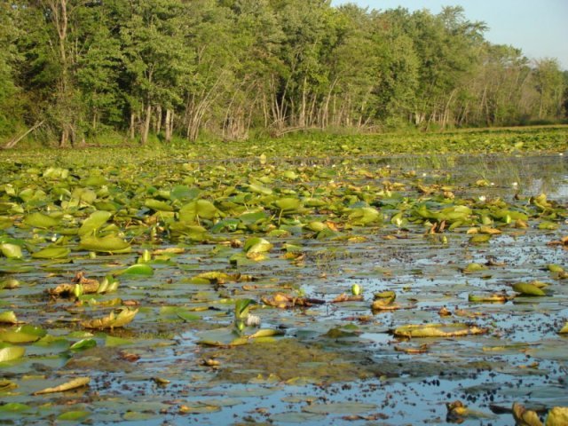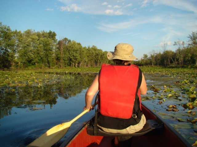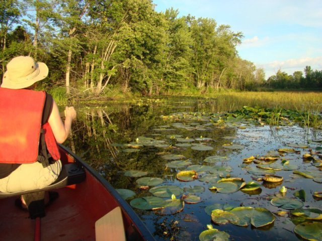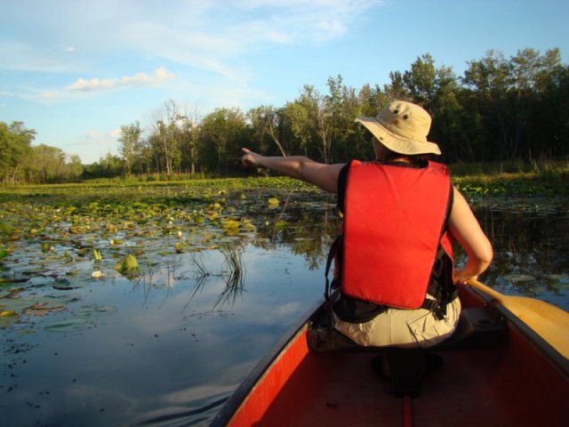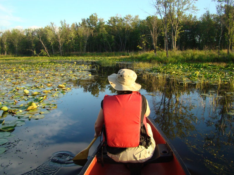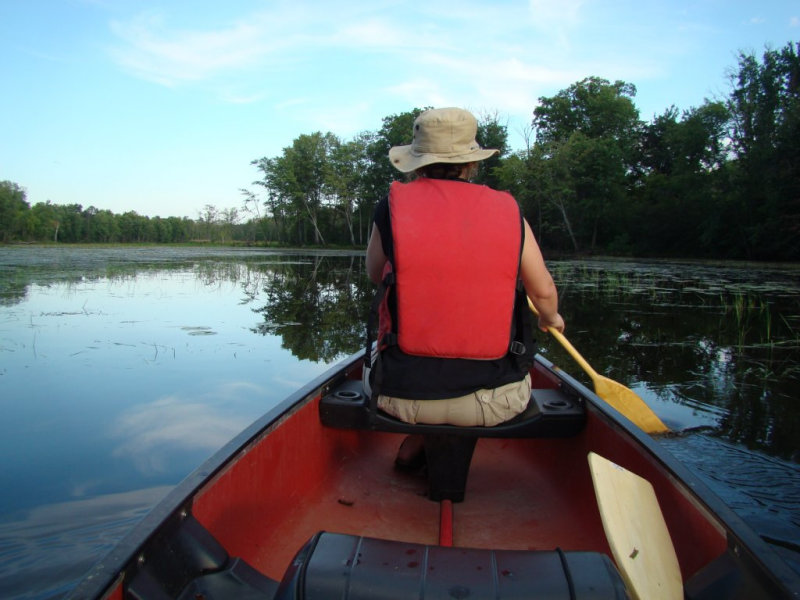 Les nénuphars sont particulièrement prospères. Ils poussent tellement densément que les feuilles s’élèvent au-dessus de l’eau pour trouver de la lumière tellement la concurrence est vive. Nous apercevons quelques ouaouarons et de temps un temps des bandes d’alevins qui fuient à notre approche. Des martins-pêcheurs pêchent sans arrêt.