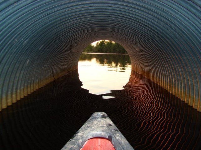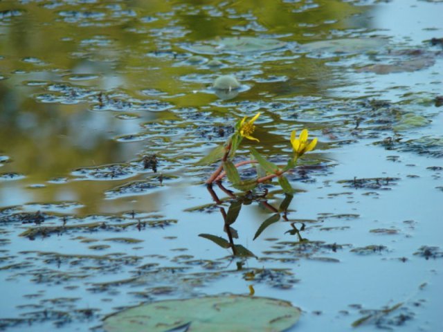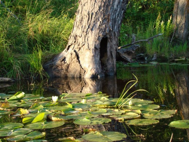 Ce ruisseau se transforme en grand marais abritant une faune et une flore d’une richesse remarquable. La végétation aquatique est dense et il nous faut naviguer dans le chenal principal. La richesse de la flore aquatique est une source d’émerveillement continuel. L’eau est très claire et je peux même observer des poissons. Alors que je longe une cabane de castor, un castor surgit et frappe l’eau violemment avec sa queue. Surpris et je sursaute. Plus j’avance, plus la rivière devient impénétrable et envahie par une végétation aquatique exubérante. Seul un tout petit chenal central permet de naviguer.