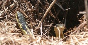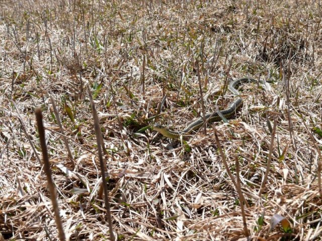 Lundi 13 avril, le soleil est magnifique. Arnaud joue au ballon dans un champ et se retrouve nez à nez avec un gros nœud de serpents entrelacés. Il m’appelle, j’arrive au galop et constate ce spectacle insolite. Une dizaine de couleuvres rayées entrelacées se prélasse au soleil à proximité d’un terrier de marmotte abandonné. J’examine les entrées du terrier et J’en vois d’autre. Je demande à Arnaud pas rassuré de surveiller les bestioles pendant que je pars ventre à terre chercher caméra et appareil photo.