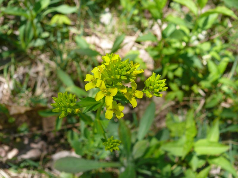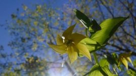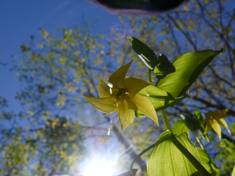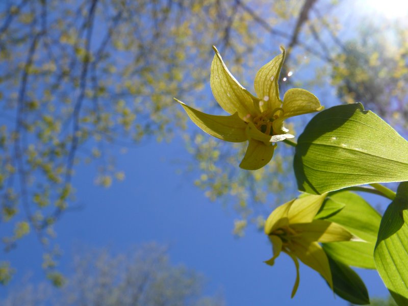 Soudain, nous découvrons une espèce menacée, la belle Uvulaire grande-fleur, Uvalaria grandiflora Smith. Elle semble un peu piteuse vue du dessus avec ses fleurs qui pendouillent mollement, mais si on prend la peine de se pencher un peu, quelle beauté !