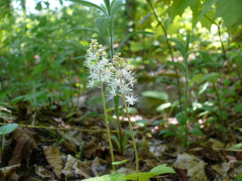 Ici, une fleur qui semble être la Tiarelle feuille-en-cœur, Tiarella Cordifolia