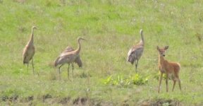 Un jeune cerf de Virginie se promène au milieu de grues du Canada aussi grande que lui ! à coté des bernacles cherchent leur pitance paisiblement.