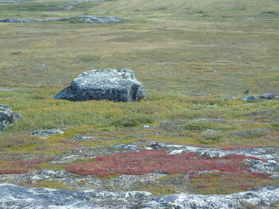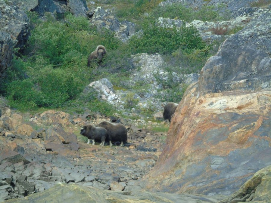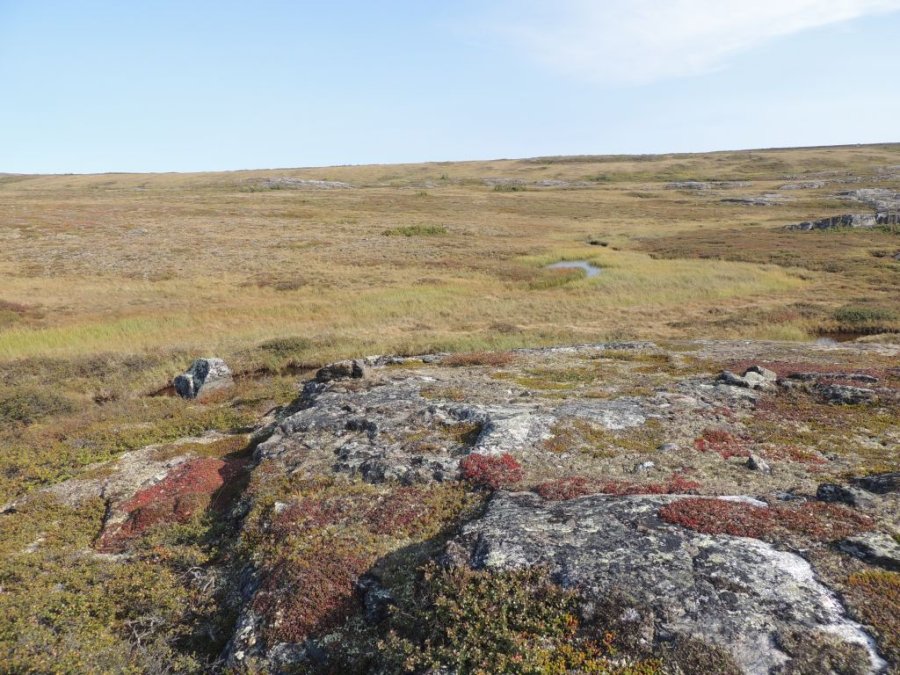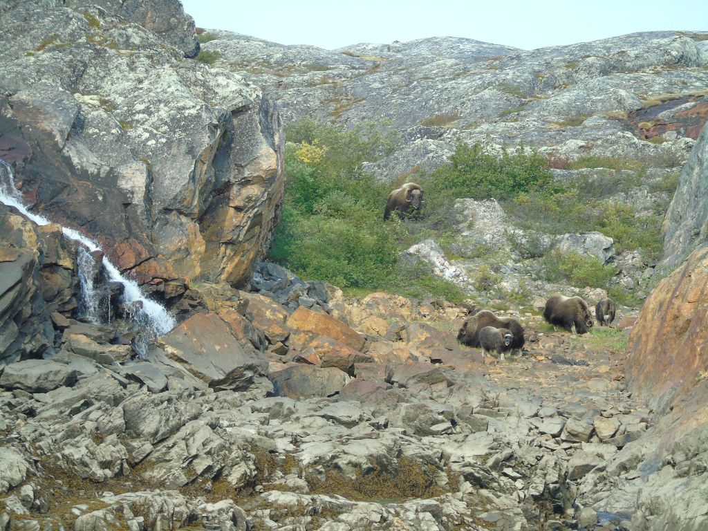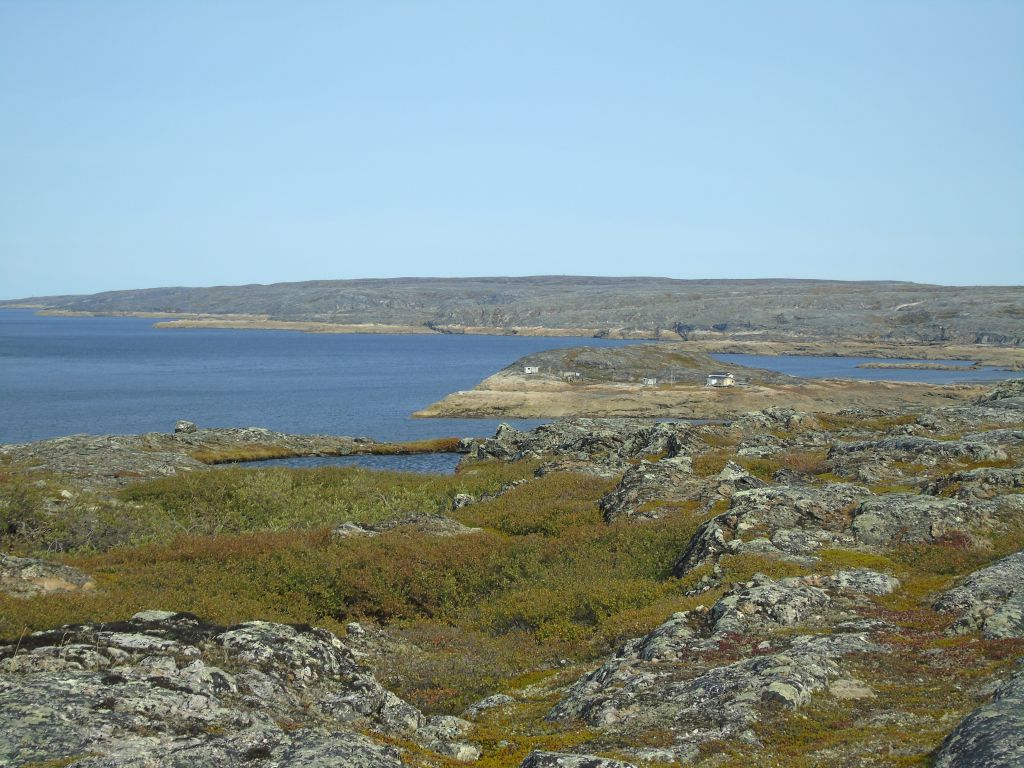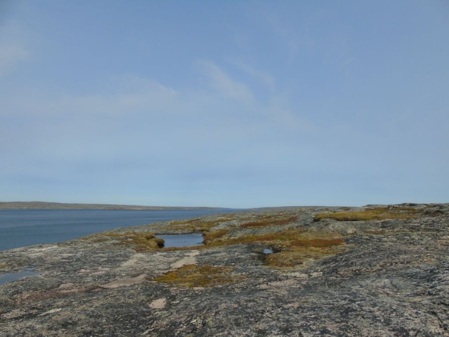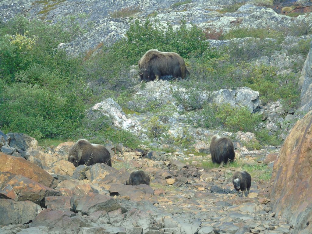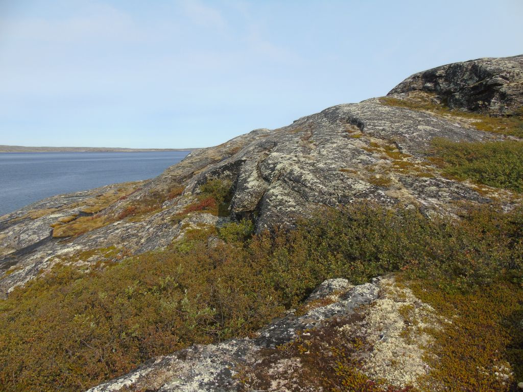 Nous partons le 2 septembre avec Allen Gordon et son puissant bateau a la découverte de la rivière Koksoak jusqu’à l’entrée de la Baie d’Ungava. En cours de route, nous avons eu le bonheur d’observer une famille de bœufs musqués. Nous avons croisé de nombreux canots, vu des bateaux de pêche sportive au saumon et nous sommes arrivés à l’embouchure de la Baie d’Ungava. Après la traditionnelle photo, nous sommes partis au camp d’Allen. Nous avons escaladé les rochers qui bordent la rivière pour nous rendre dans la Taïga. De vastes paysages avec des barres rocheuses, des petits lacs, des prairies me donnaient envie d’aller découvrir ce qui se cachait derrière la lige d’horizon. La taïga me fascine, m’attire. Ici tout est minéral, la végétation rase. Les roches sont couvertes de lichens, de bleuets, des cèpes poussent dans les endroits les plus inattendu. On peut matcher des jours et des jours sans obstacles et découvrir des passages sans cesse changeant. Par endroit, on se croirait dans des jardins japonais ou chinois. Sable, gravier, bonzaï, mousses, fleurs délicates et menue, tout y est. La toundra c’est zen, c’est attirant, c’est reposant et régénérant. Hélas, la belle période, sans neige, sans glace ou sans moustiques ou simulie est courte ! Cela rend son exploration encore plus plaisante ! Allen et sa famille nous ont invité à manger des plats traditionnels et il nous a montré des sites archéologiques en nous expliquant la vie des anciens Inuits. Ce fût une extraordinaire journée de découverte. Merci Allen.