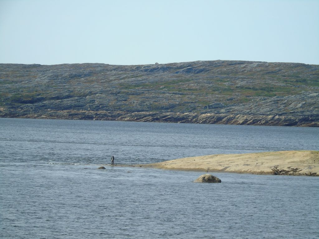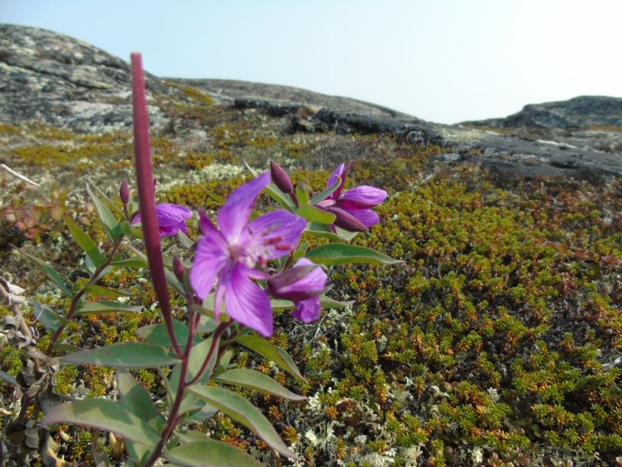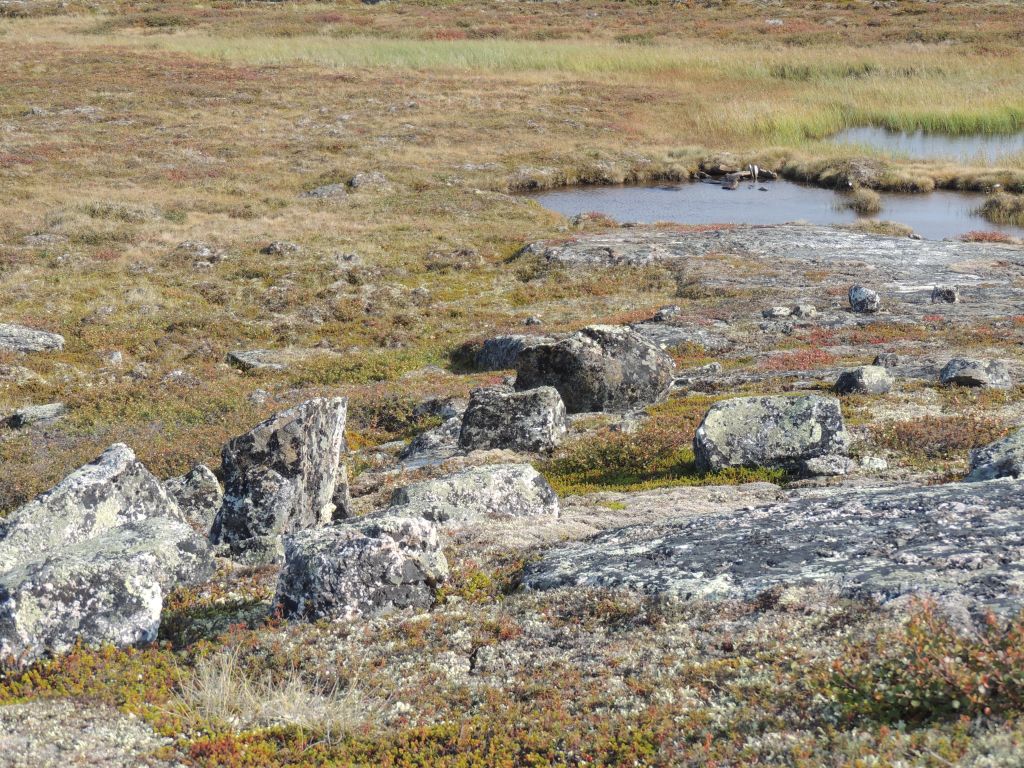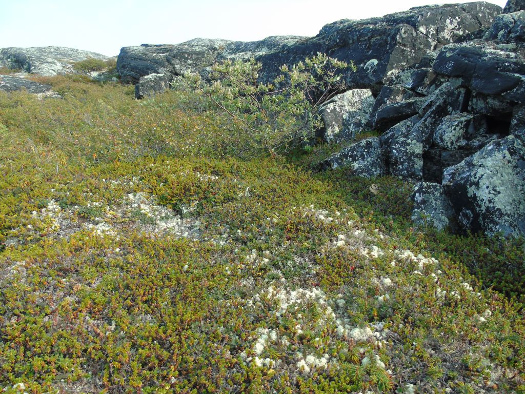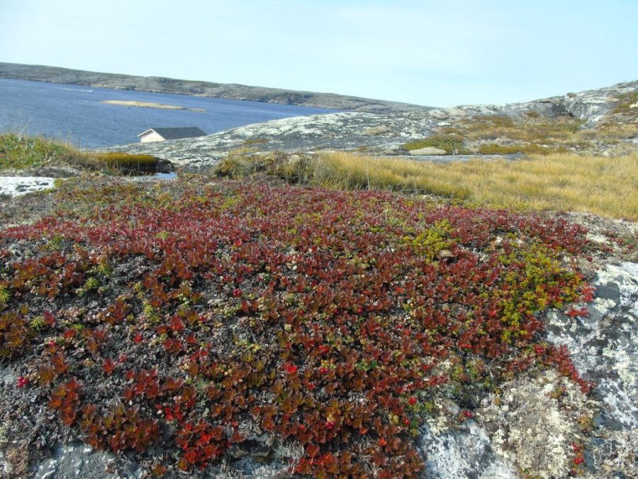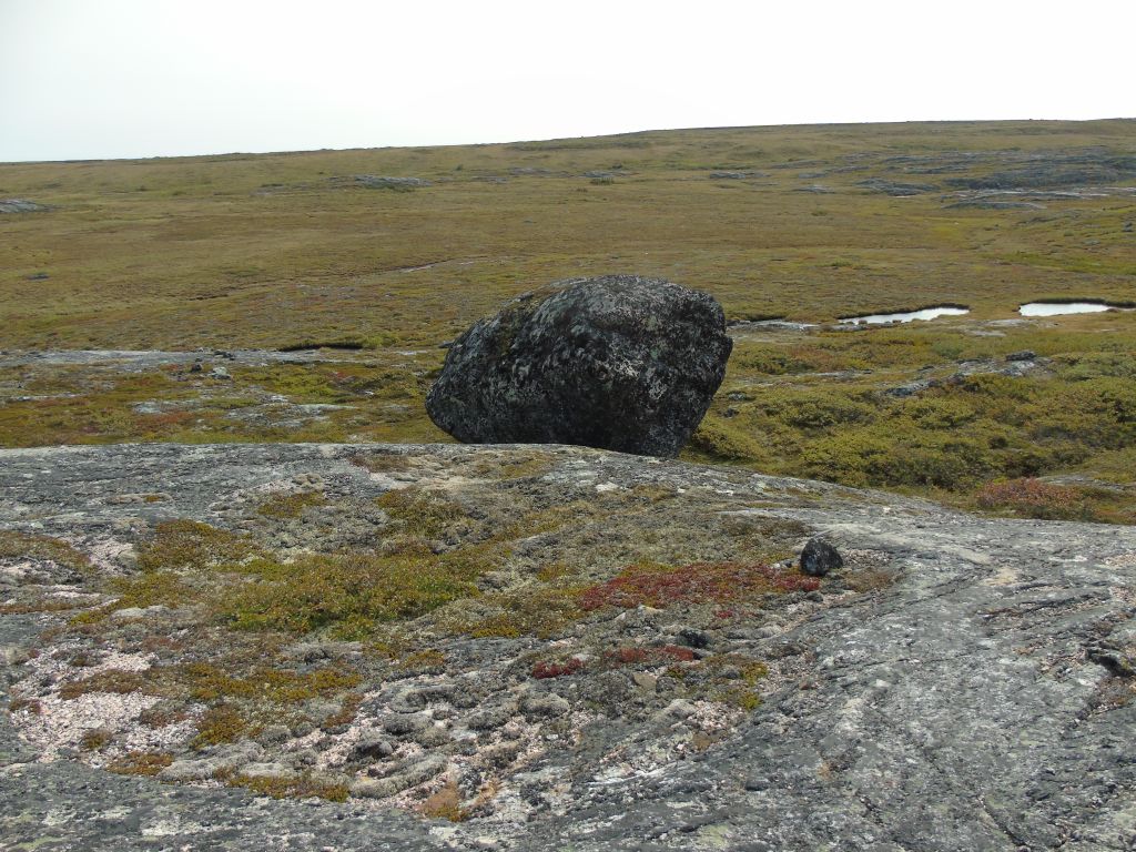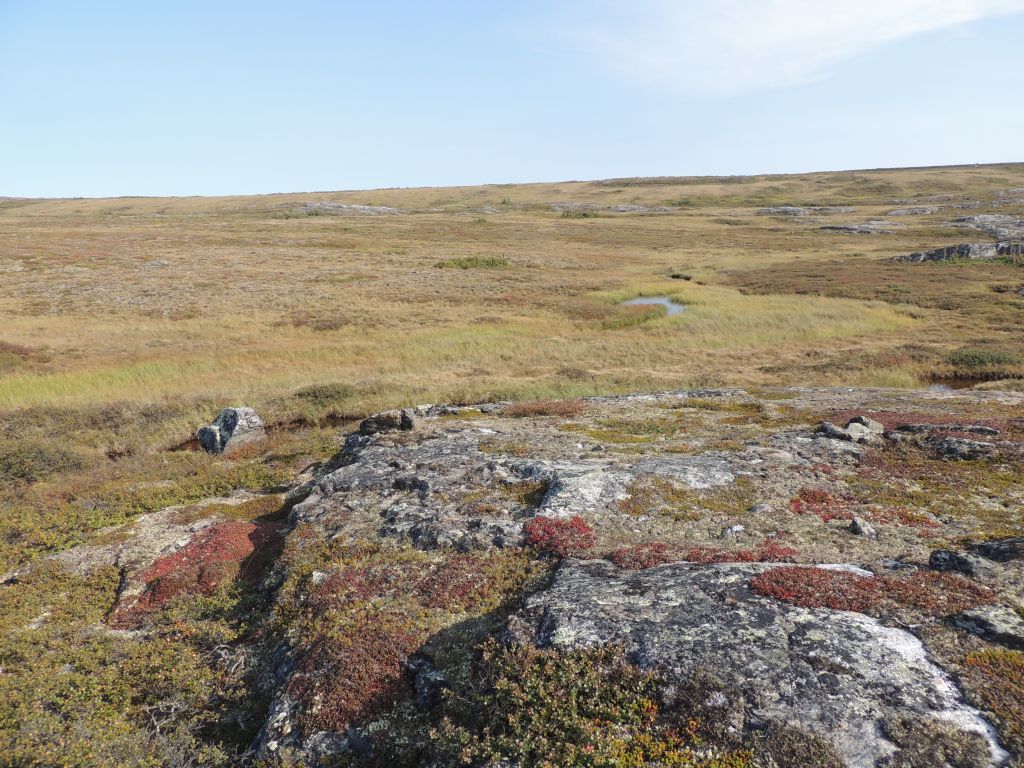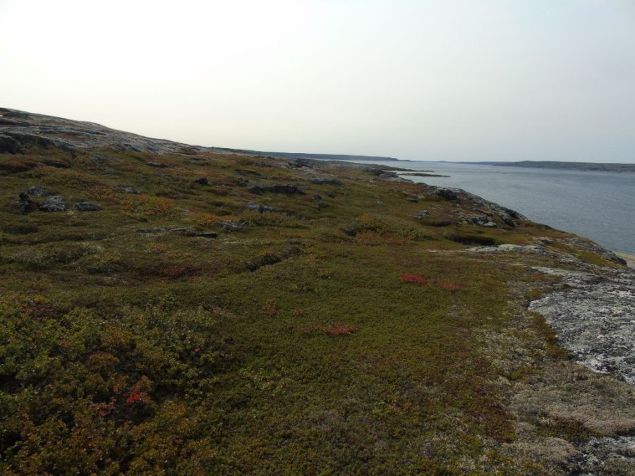 Nous partons le 2 septembre avec Allen Gordon et son puissant bateau a la découverte de la rivière Koksoak jusqu’à l’entrée de la Baie d’Ungava. En cours de route, nous avons eu le bonheur d’observer une famille de bœufs musqués. Nous avons croisé de nombreux canots, vu des bateaux de pêche sportive au saumon et nous sommes arrivés à l’embouchure de la Baie d’Ungava. Après la traditionnelle photo, nous sommes partis au camp d’Allen. Nous avons escaladé les rochers qui bordent la rivière pour nous rendre dans la Taïga. De vastes paysages avec des barres rocheuses, des petits lacs, des prairies me donnaient envie d’aller découvrir ce qui se cachait derrière la lige d’horizon. La taïga me fascine, m’attire. Ici tout est minéral, la végétation rase. Les roches sont couvertes de lichens, de bleuets, des cèpes poussent dans les endroits les plus inattendu. On peut matcher des jours et des jours sans obstacles et découvrir des passages sans cesse changeant. Par endroit, on se croirait dans des jardins japonais ou chinois. Sable, gravier, bonzaï, mousses, fleurs délicates et menue, tout y est. La toundra c’est zen, c’est attirant, c’est reposant et régénérant. Hélas, la belle période, sans neige, sans glace ou sans moustiques ou simulie est courte ! Cela rend son exploration encore plus plaisante ! Allen et sa famille nous ont invité à manger des plats traditionnels et il nous a montré des sites archéologiques en nous expliquant la vie des anciens Inuits. Ce fût une extraordinaire journée de découverte. Merci Allen.