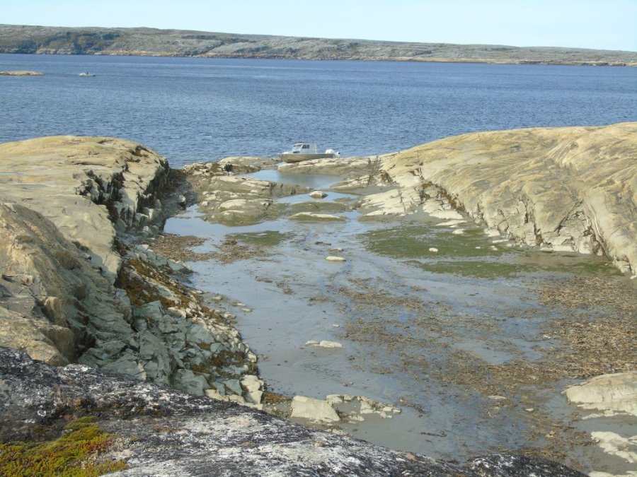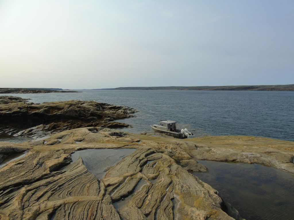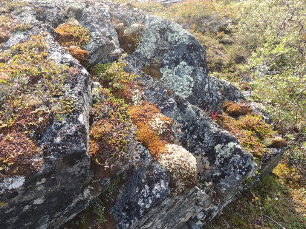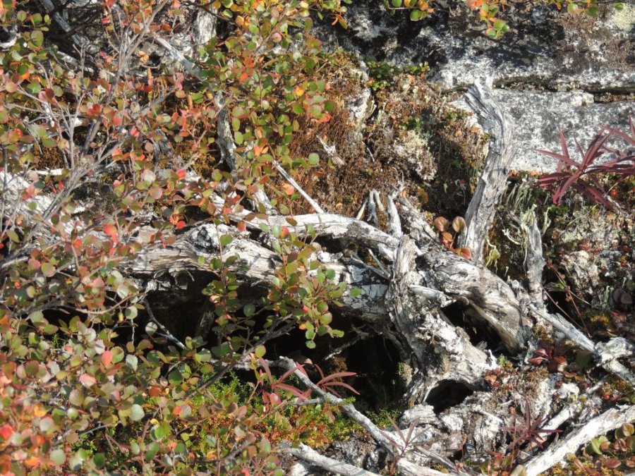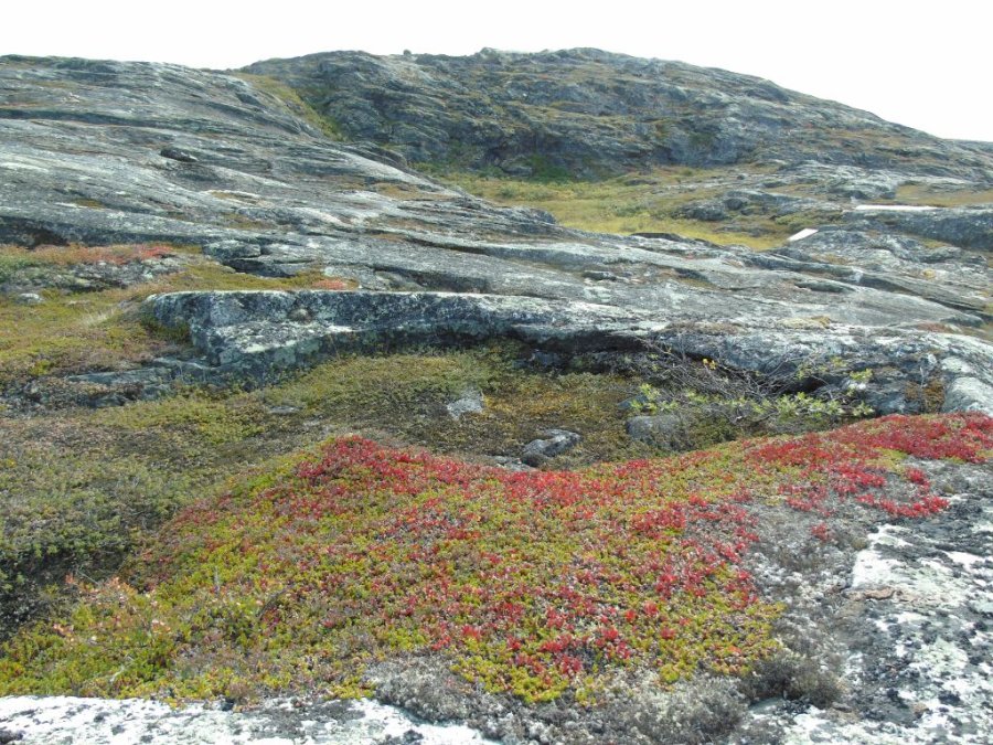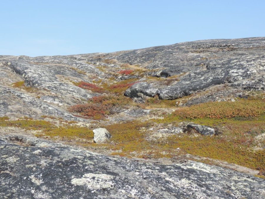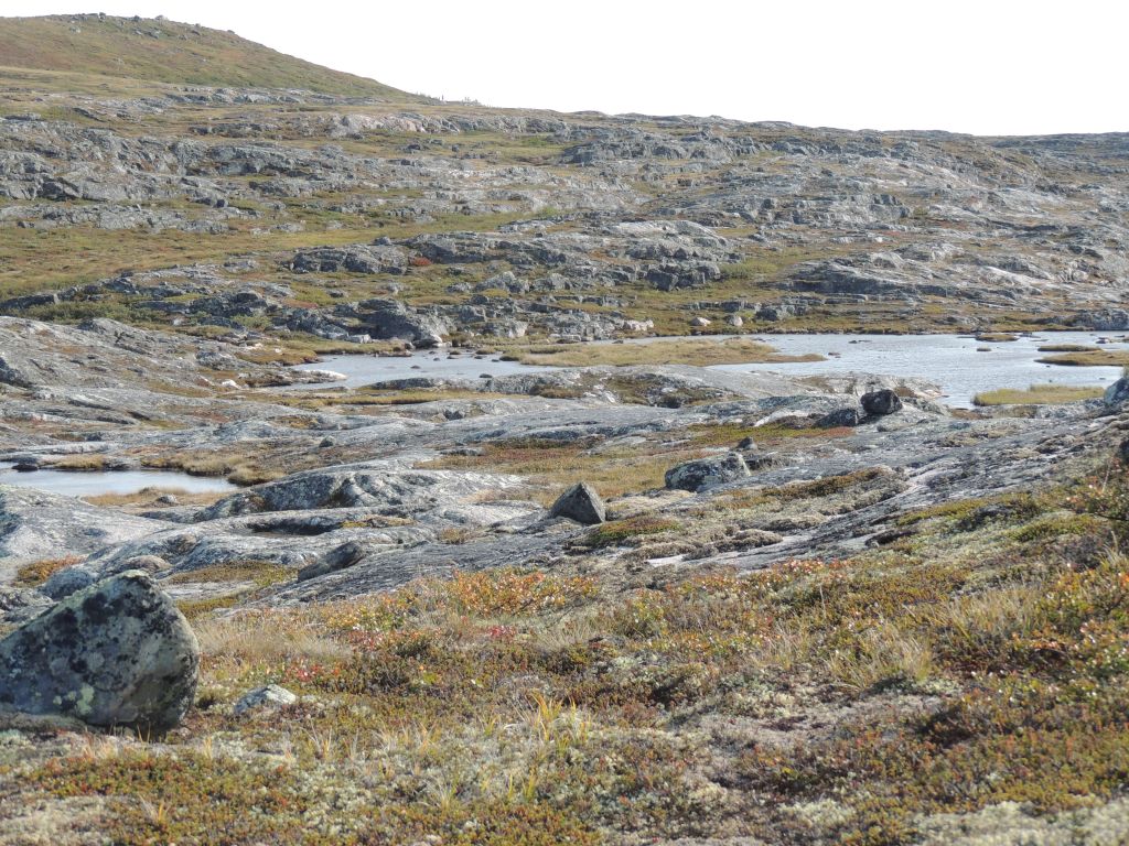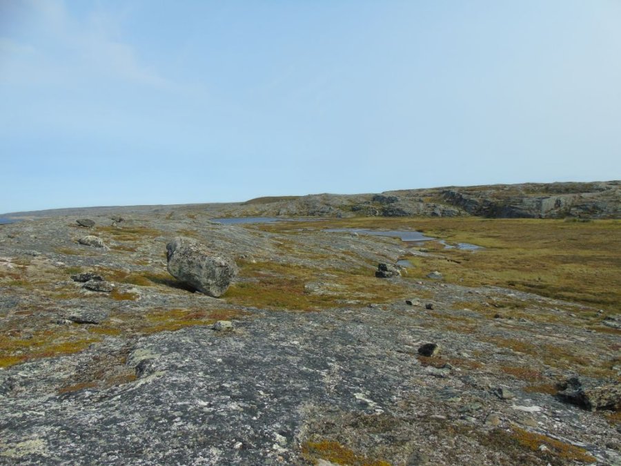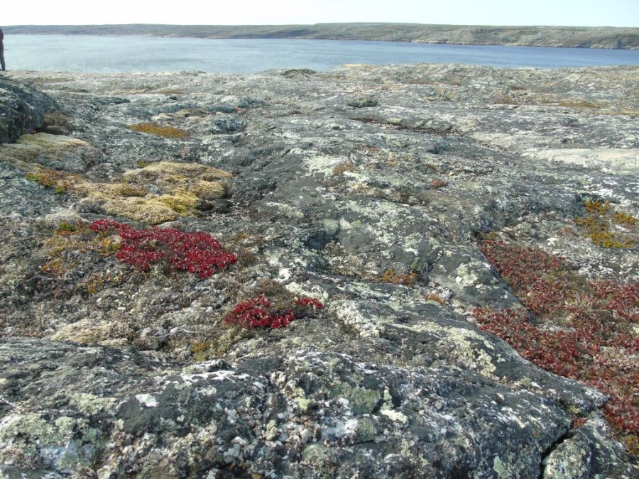 Nous partons le 2 septembre avec Allen Gordon et son puissant bateau a la découverte de la rivière Koksoak jusqu’à l’entrée de la Baie d’Ungava. En cours de route, nous avons eu le bonheur d’observer une famille de bœufs musqués. Nous avons croisé de nombreux canots, vu des bateaux de pêche sportive au saumon et nous sommes arrivés à l’embouchure de la Baie d’Ungava. Après la traditionnelle photo, nous sommes partis au camp d’Allen. Nous avons escaladé les rochers qui bordent la rivière pour nous rendre dans la Taïga. De vastes paysages avec des barres rocheuses, des petits lacs, des prairies me donnaient envie d’aller découvrir ce qui se cachait derrière la lige d’horizon. La taïga me fascine, m’attire. Ici tout est minéral, la végétation rase. Les roches sont couvertes de lichens, de bleuets, des cèpes poussent dans les endroits les plus inattendu. On peut matcher des jours et des jours sans obstacles et découvrir des passages sans cesse changeant. Par endroit, on se croirait dans des jardins japonais ou chinois. Sable, gravier, bonzaï, mousses, fleurs délicates et menue, tout y est. La toundra c’est zen, c’est attirant, c’est reposant et régénérant. Hélas, la belle période, sans neige, sans glace ou sans moustiques ou simulie est courte ! Cela rend son exploration encore plus plaisante ! Allen et sa famille nous ont invité à manger des plats traditionnels et il nous a montré des sites archéologiques en nous expliquant la vie des anciens Inuits. Ce fût une extraordinaire journée de découverte. Merci Allen.