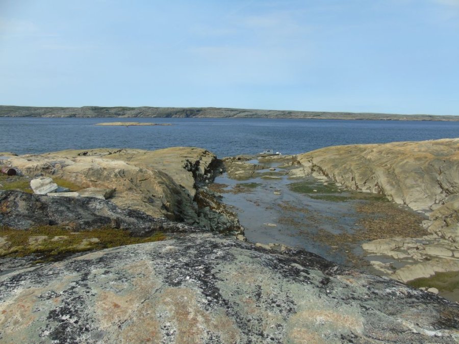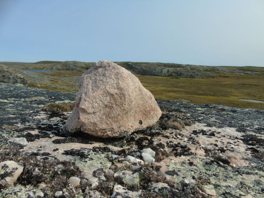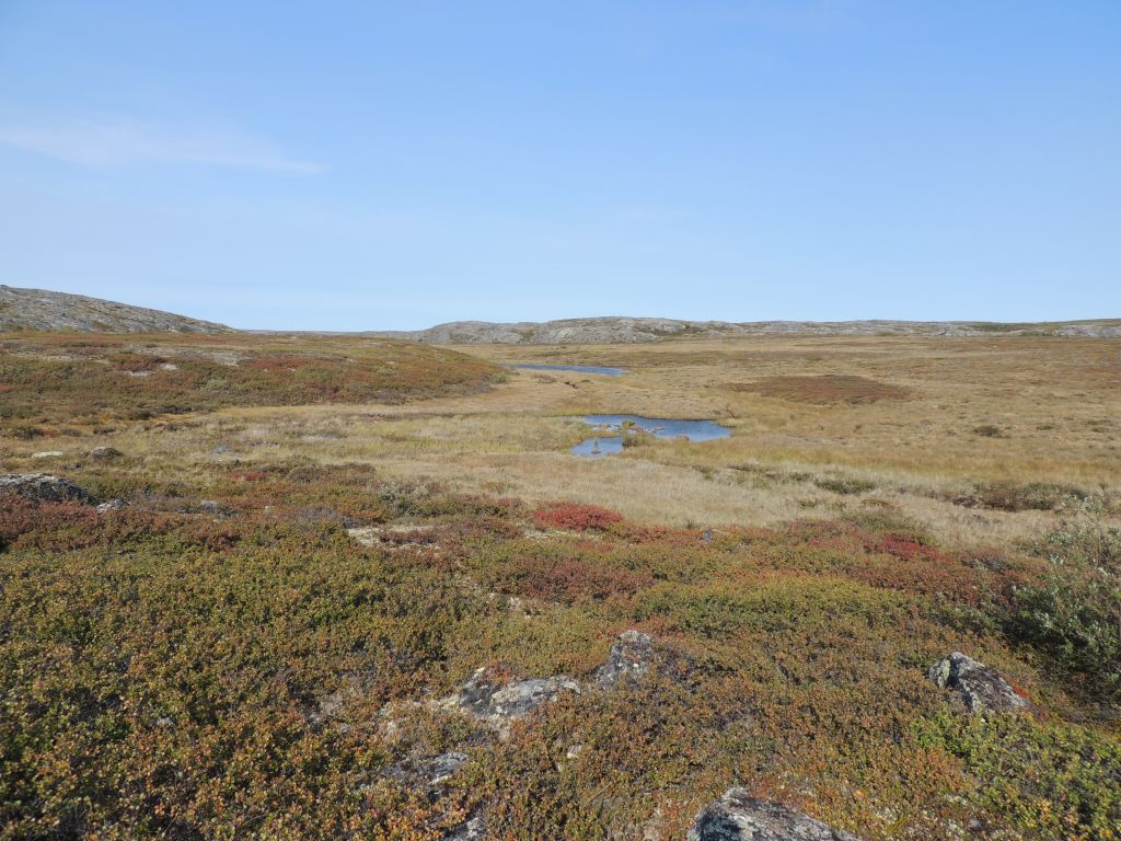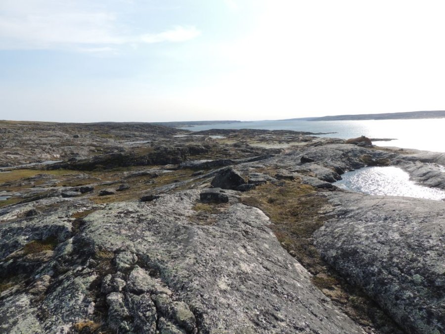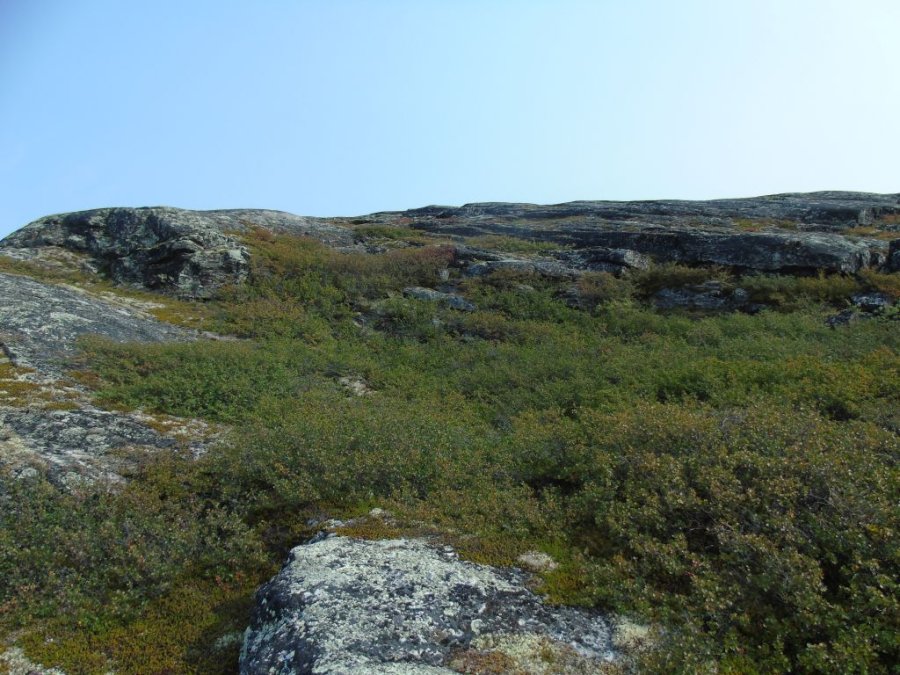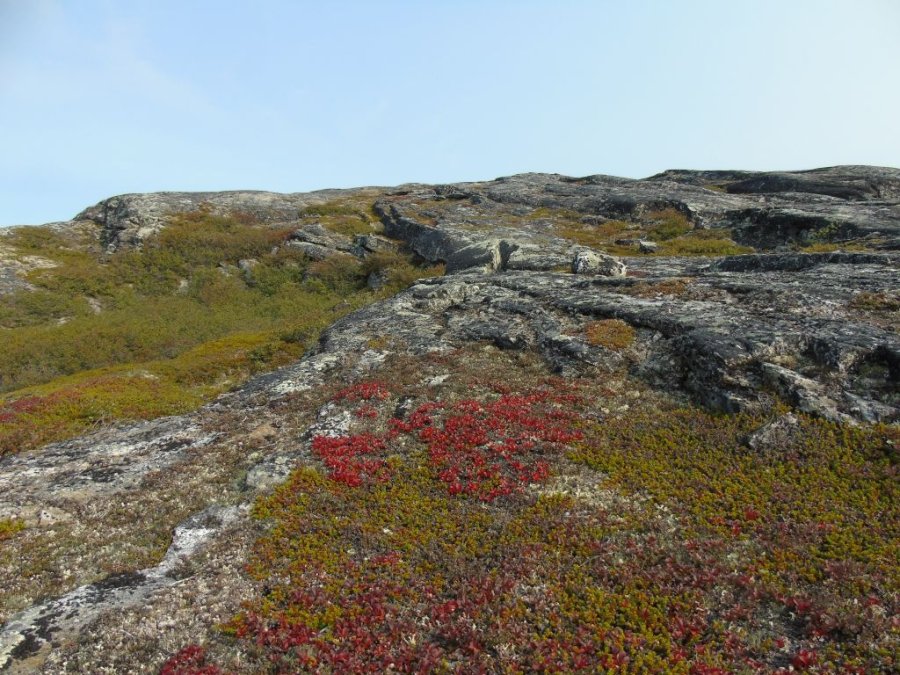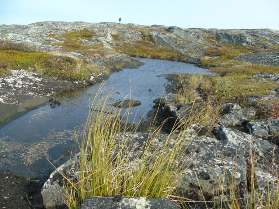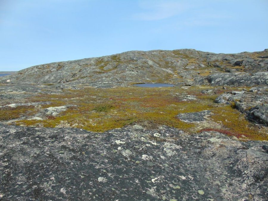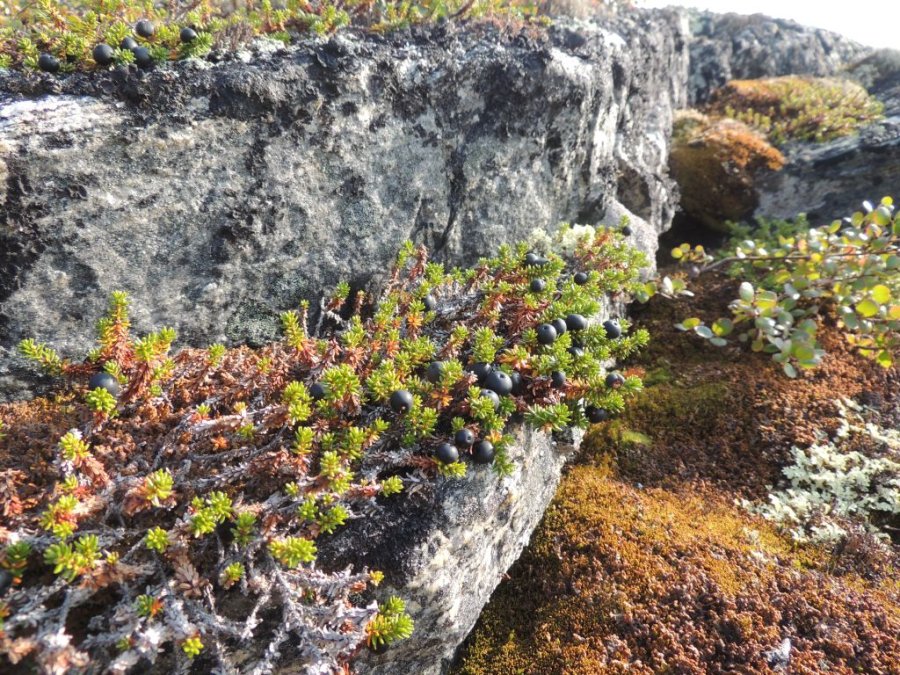 Nous partons le 2 septembre avec Allen Gordon et son puissant bateau a la découverte de la rivière Koksoak jusqu’à l’entrée de la Baie d’Ungava. En cours de route, nous avons eu le bonheur d’observer une famille de bœufs musqués. Nous avons croisé de nombreux canots, vu des bateaux de pêche sportive au saumon et nous sommes arrivés à l’embouchure de la Baie d’Ungava. Après la traditionnelle photo, nous sommes partis au camp d’Allen. Nous avons escaladé les rochers qui bordent la rivière pour nous rendre dans la Taïga. De vastes paysages avec des barres rocheuses, des petits lacs, des prairies me donnaient envie d’aller découvrir ce qui se cachait derrière la lige d’horizon. La taïga me fascine, m’attire. Ici tout est minéral, la végétation rase. Les roches sont couvertes de lichens, de bleuets, des cèpes poussent dans les endroits les plus inattendu. On peut matcher des jours et des jours sans obstacles et découvrir des passages sans cesse changeant. Par endroit, on se croirait dans des jardins japonais ou chinois. Sable, gravier, bonzaï, mousses, fleurs délicates et menue, tout y est. La toundra c’est zen, c’est attirant, c’est reposant et régénérant. Hélas, la belle période, sans neige, sans glace ou sans moustiques ou simulie est courte ! Cela rend son exploration encore plus plaisante ! Allen et sa famille nous ont invité à manger des plats traditionnels et il nous a montré des sites archéologiques en nous expliquant la vie des anciens Inuits. Ce fût une extraordinaire journée de découverte. Merci Allen.