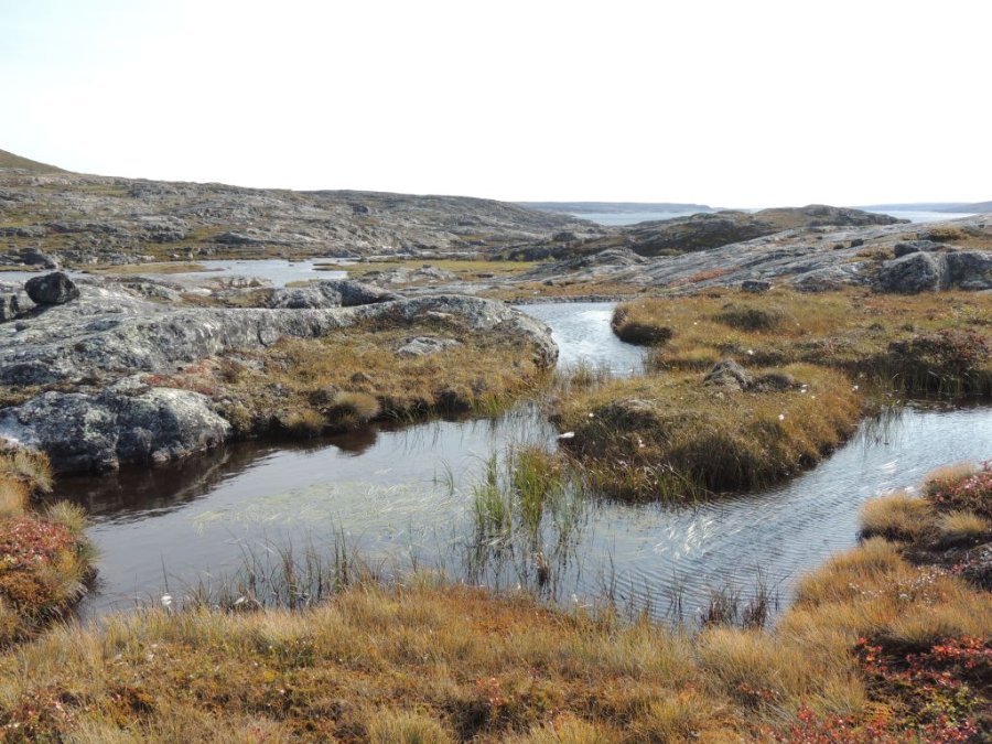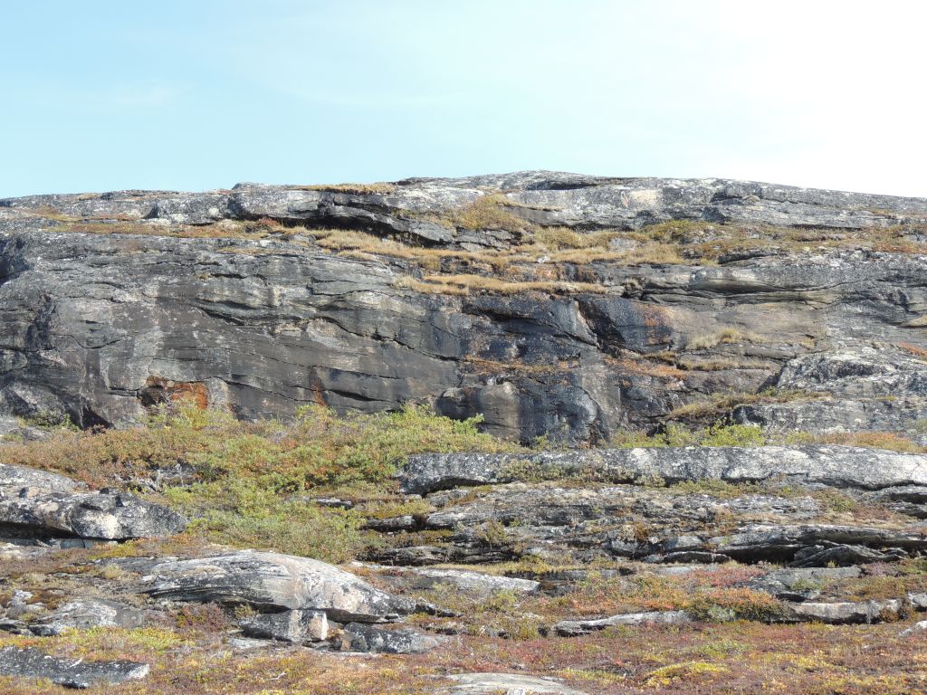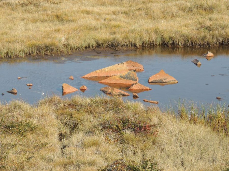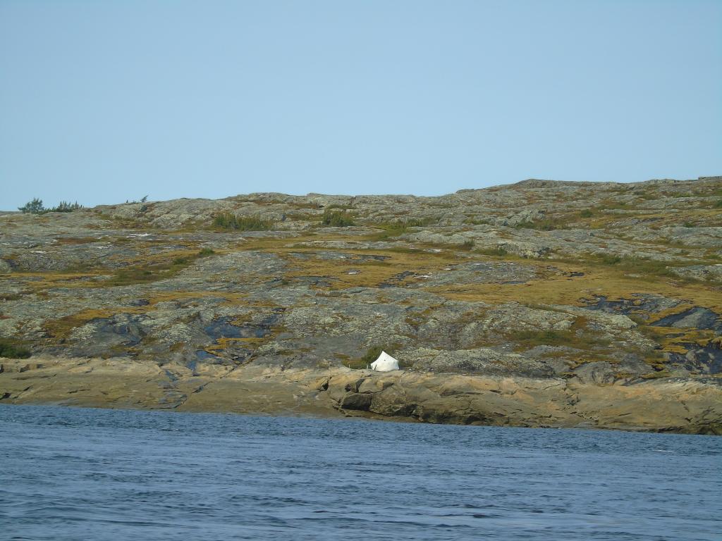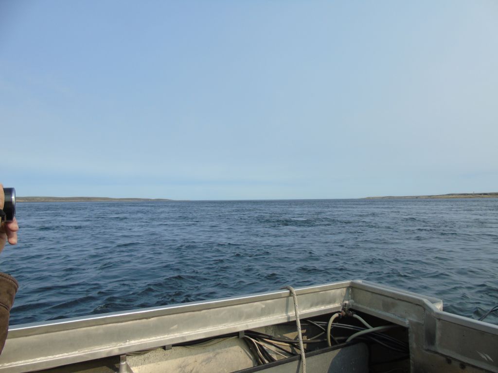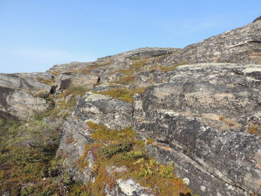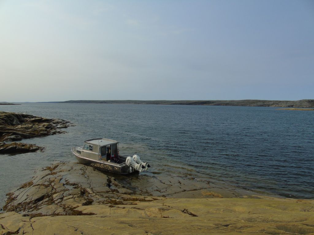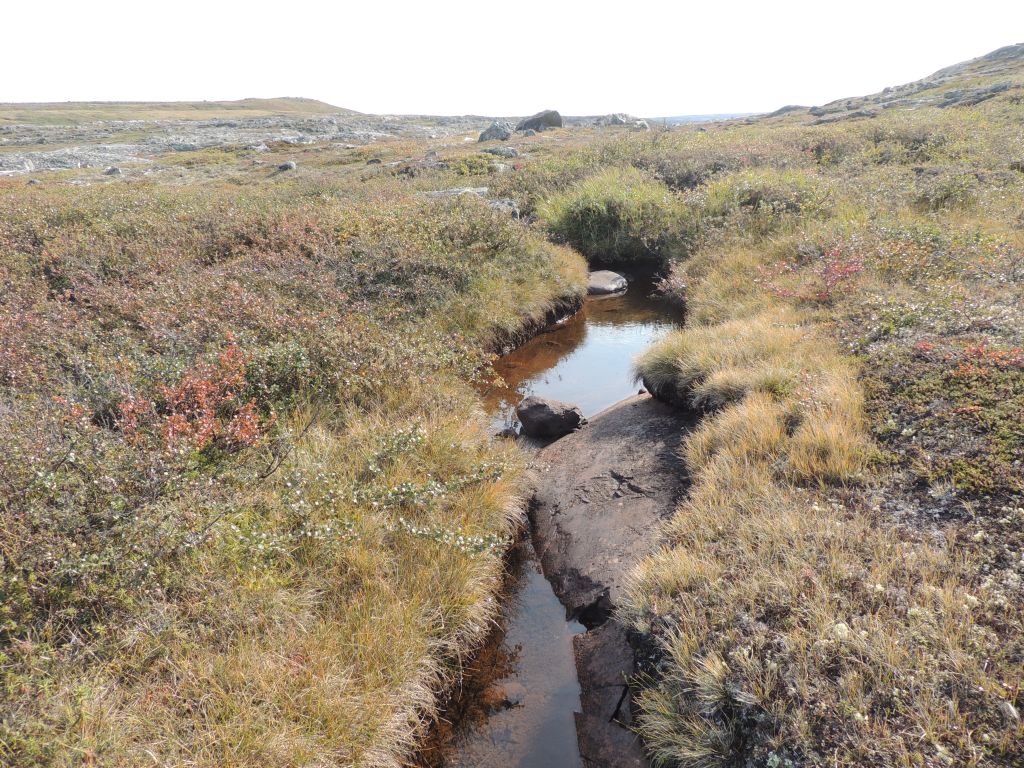 Nous partons le 2 septembre avec Allen Gordon et son puissant bateau a la découverte de la rivière Koksoak jusqu’à l’entrée de la Baie d’Ungava. En cours de route, nous avons eu le bonheur d’observer une famille de bœufs musqués. Nous avons croisé de nombreux canots, vu des bateaux de pêche sportive au saumon et nous sommes arrivés à l’embouchure de la Baie d’Ungava. Après la traditionnelle photo, nous sommes partis au camp d’Allen. Nous avons escaladé les rochers qui bordent la rivière pour nous rendre dans la Taïga. De vastes paysages avec des barres rocheuses, des petits lacs, des prairies me donnaient envie d’aller découvrir ce qui se cachait derrière la lige d’horizon. La taïga me fascine, m’attire. Ici tout est minéral, la végétation rase. Les roches sont couvertes de lichens, de bleuets, des cèpes poussent dans les endroits les plus inattendu. On peut matcher des jours et des jours sans obstacles et découvrir des passages sans cesse changeant. Par endroit, on se croirait dans des jardins japonais ou chinois. Sable, gravier, bonzaï, mousses, fleurs délicates et menue, tout y est. La toundra c’est zen, c’est attirant, c’est reposant et régénérant. Hélas, la belle période, sans neige, sans glace ou sans moustiques ou simulie est courte ! Cela rend son exploration encore plus plaisante ! Allen et sa famille nous ont invité à manger des plats traditionnels et il nous a montré des sites archéologiques en nous expliquant la vie des anciens Inuits. Ce fût une extraordinaire journée de découverte. Merci Allen.