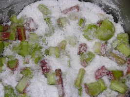 Aux 6 kilos de tige, j’ajoute 4 kilos de sucre blanc. Je mélange le tout et je laisse macérer minimum une nuit au frigo.