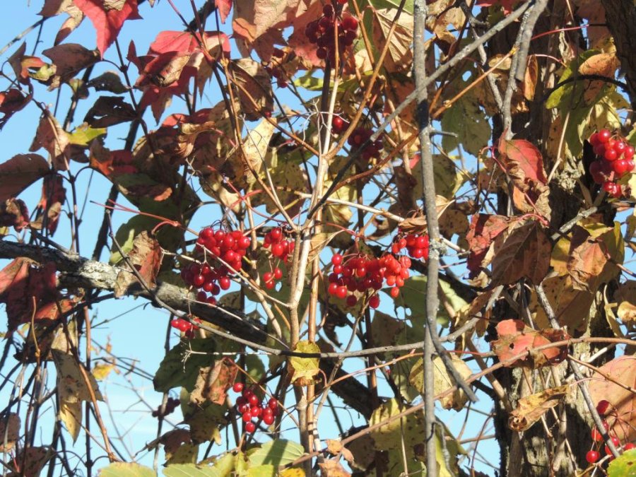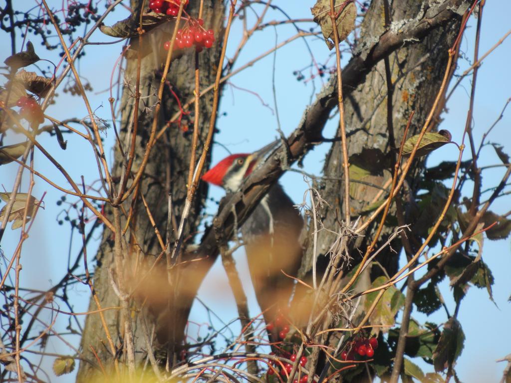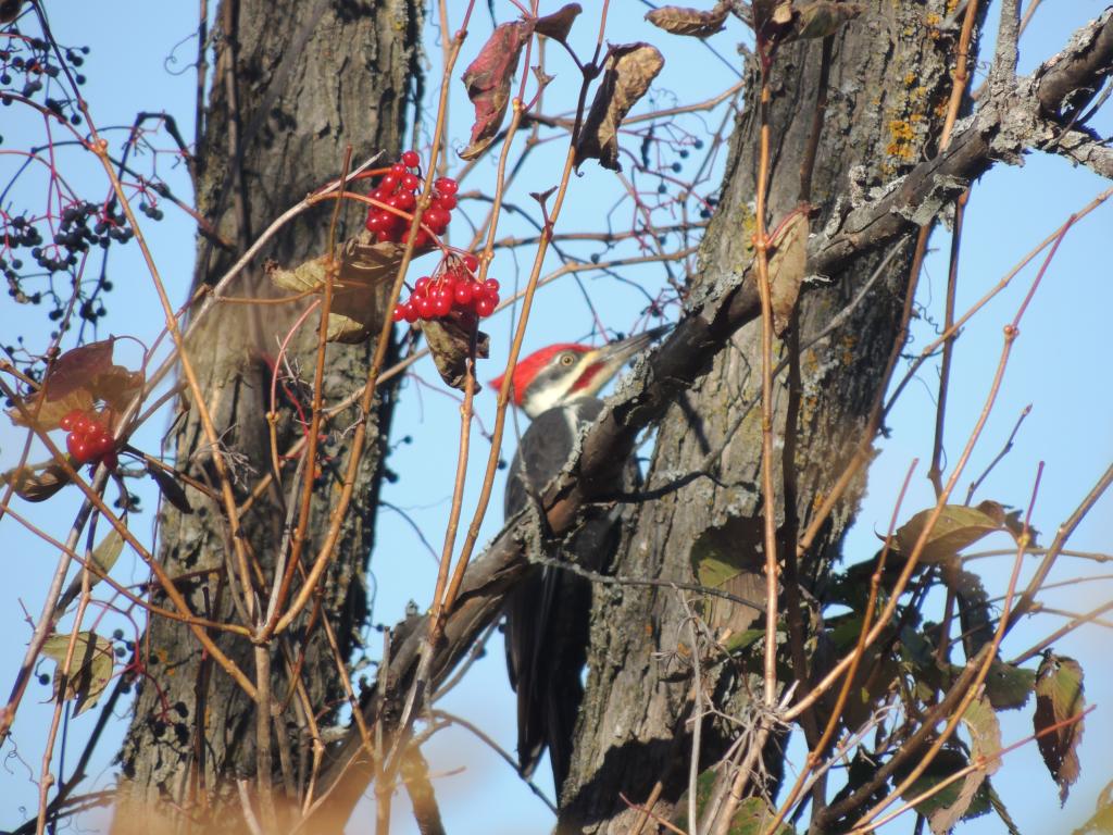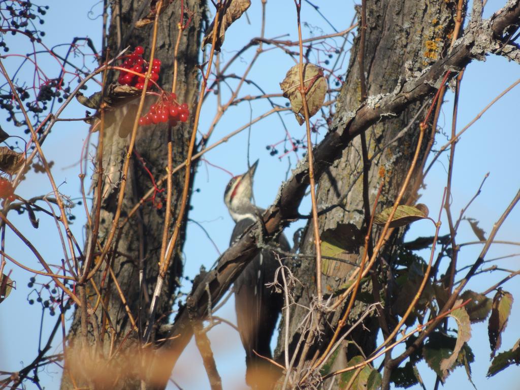 Le 12 octobre 2013, alors que nous nous promenions à vélo, nous avons eu la chance d’observer un Grand Pic, dryocopus pileatus, qui se gavait de baies le long de la piste cyclable.
