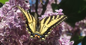 Plusieurs Papillons tigrés du Canada m’ont offert un ballet printanier merveilleux sur les lilas devant ma porte !