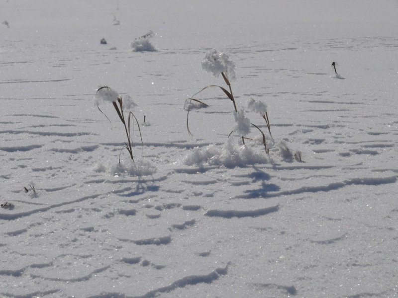 Souvent, on les voit accompagner d’une boule de poils qui les précède. Remarquez que par mimétisme avec la végétation environnante, la boule de poils est également givrée.