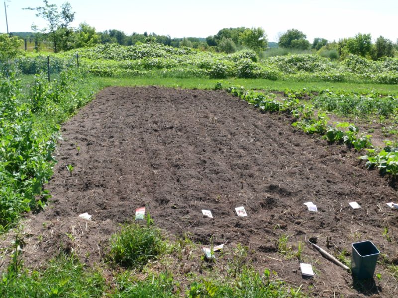Les plantations du jour (4 juillet 08). Terre préparée au motoculteur électrique.
