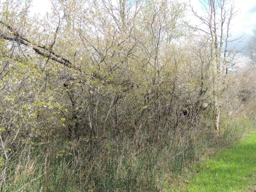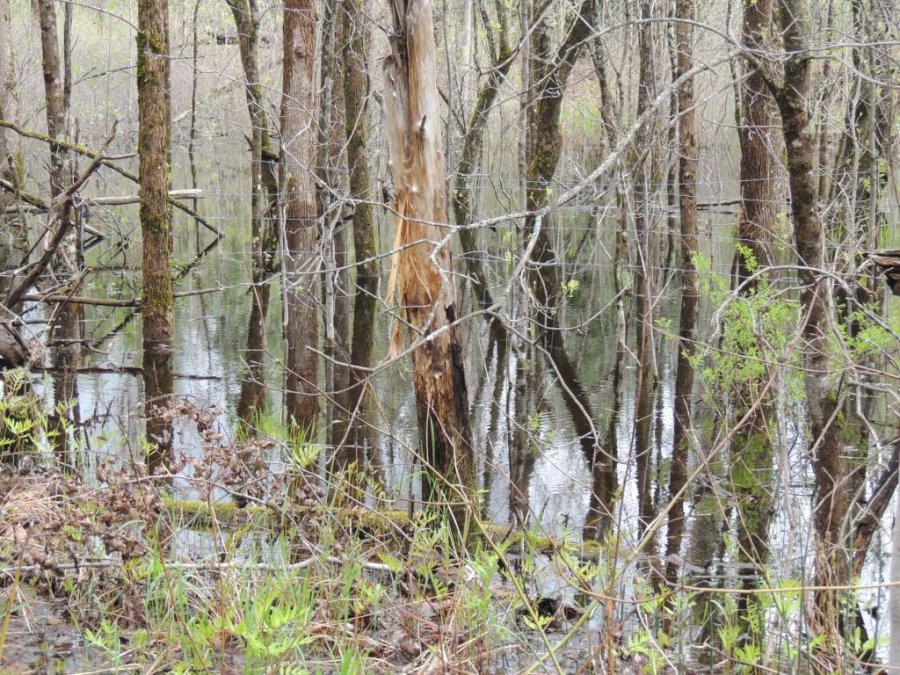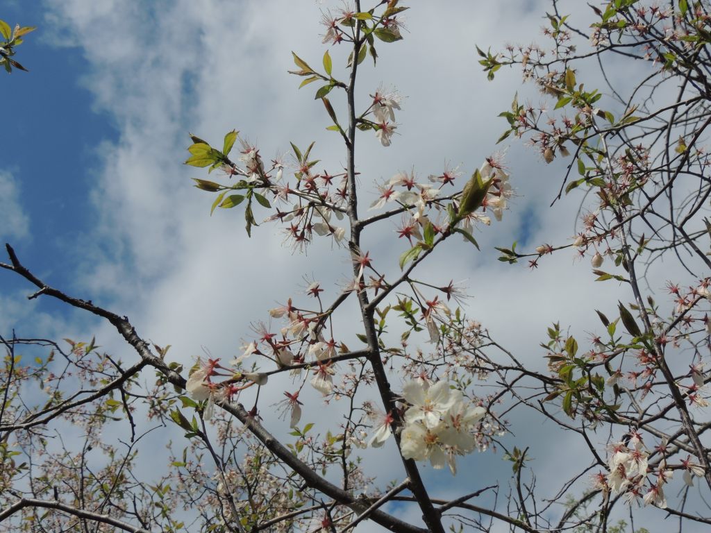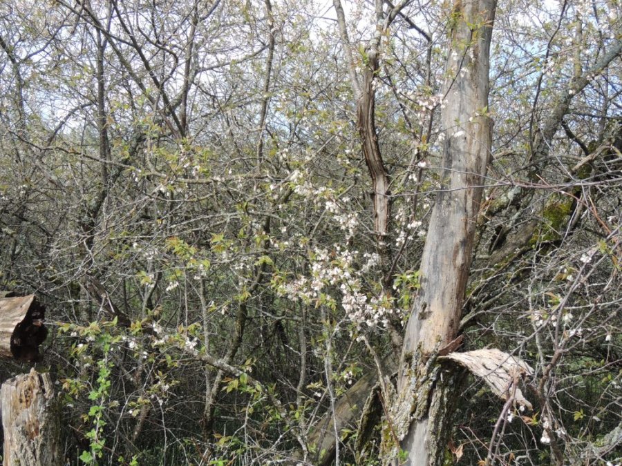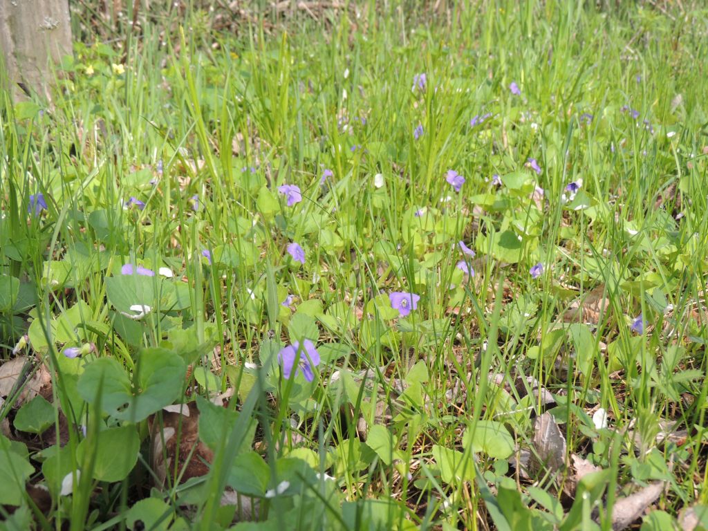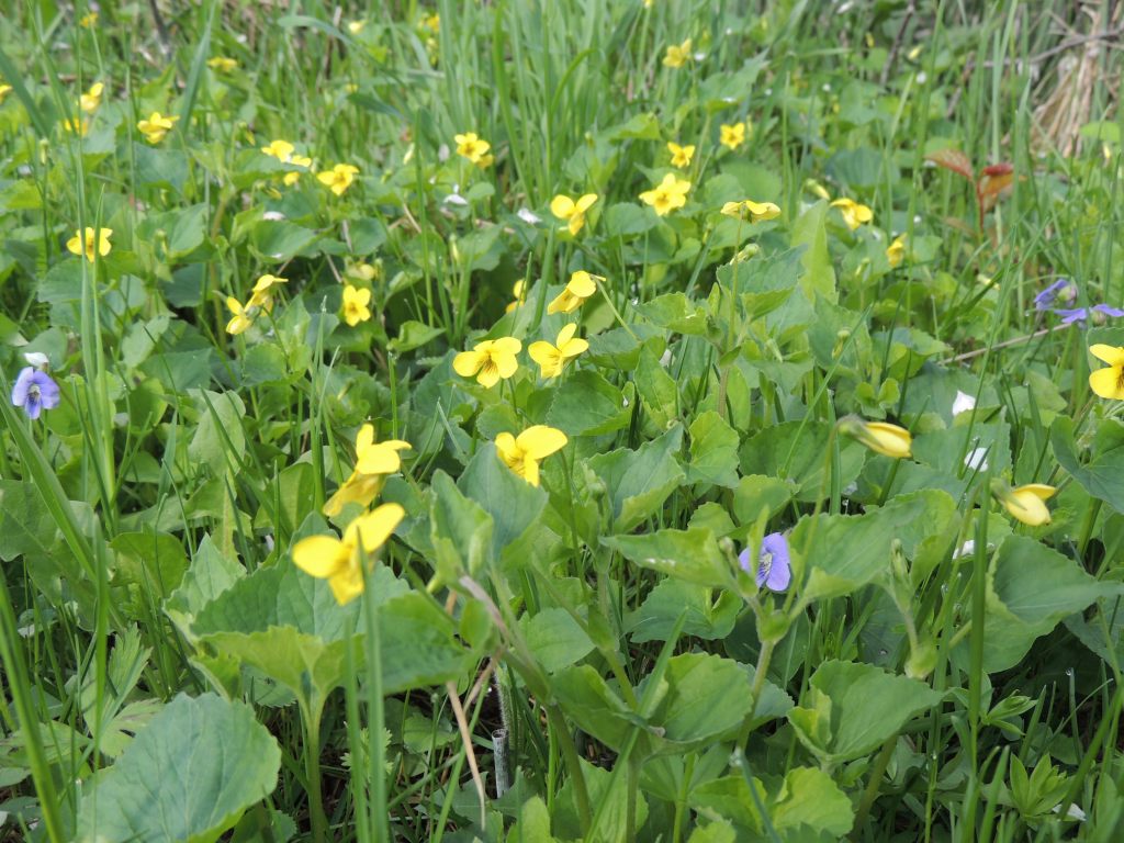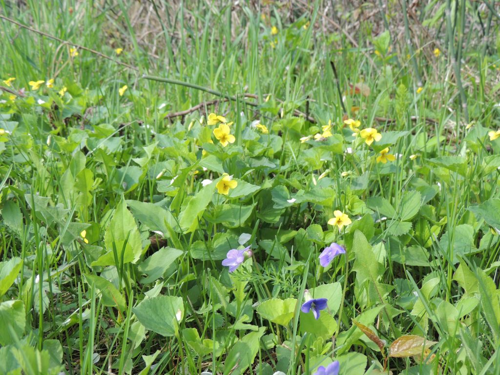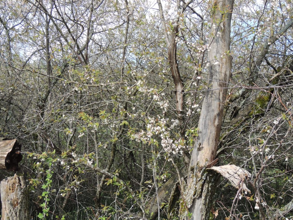 Je continue ma balade. Dans la forêt inondée, j’ai la surprise de voir des canards en grand nombre. Arrivée en prairies, les amélanchiers, les cerisiers sauvages sont en fleur. et le sol est couvert par endroit de violettes et de fleurs jaunes.
