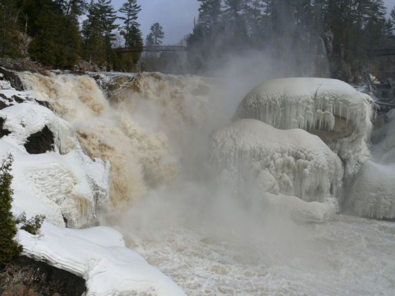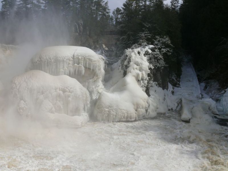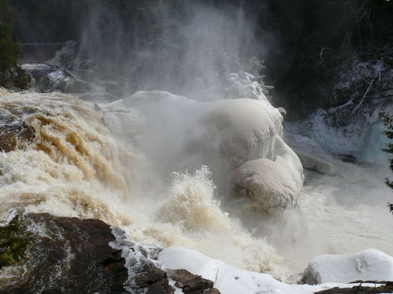 La vapeur d’eau a gelé et entoure d’une gangue de glace la végétation autour des chutes.