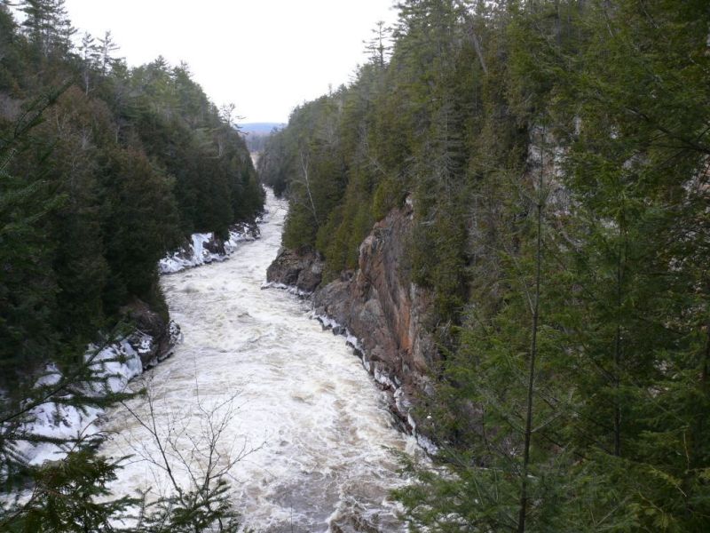 De la glissière à billot, on devine le canyon qui enserre la rivière.