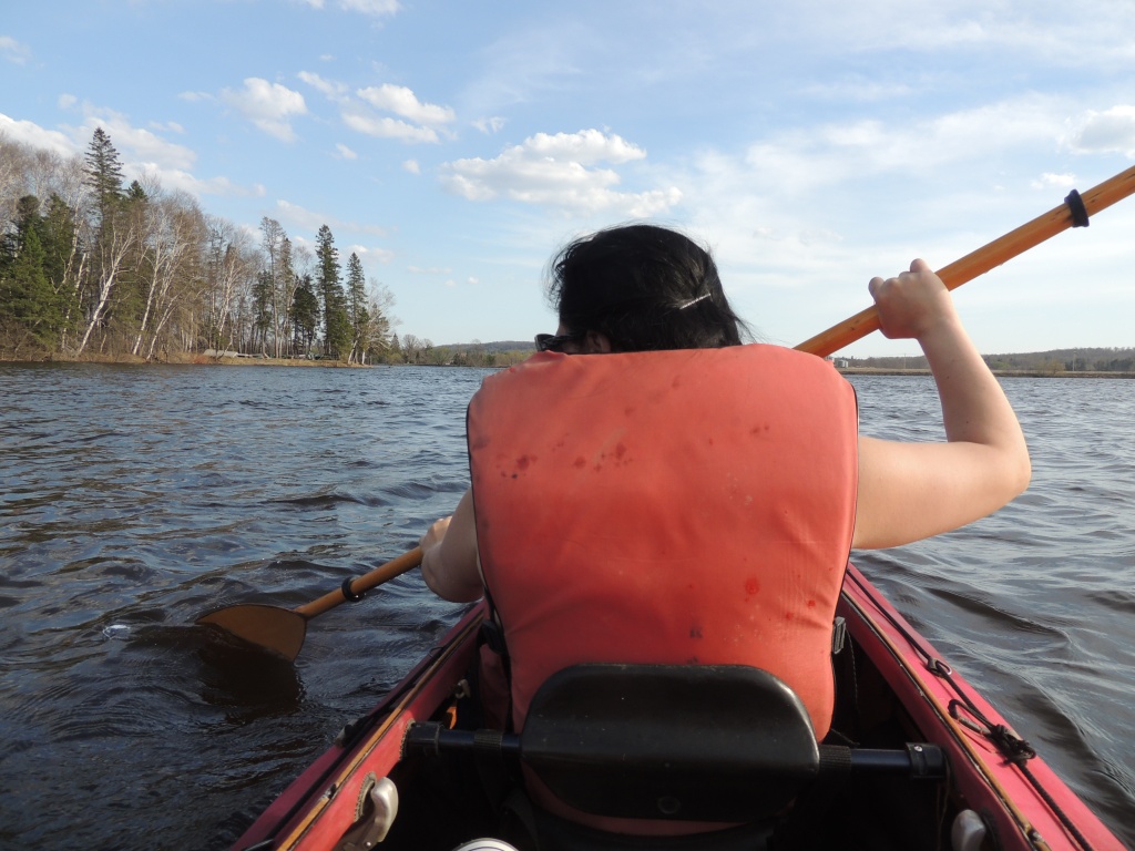 Le courant était fort, le vent également ! Nous avons descendu le petit rapide, presque inexistant en été au-dessus du quai. Ça a bougé fort. Une main invisible nous a secouée en tous sens en en bas du rapide, le kayak a fait une tête à queue imprévisible ! Je ne l’ai pas vu arrivé !
