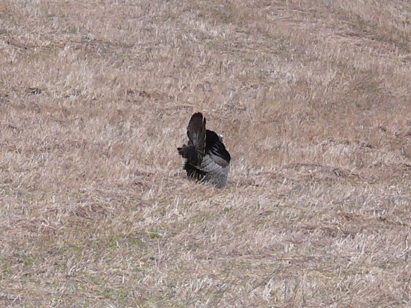 Le 18 avril 2007, en nous baladant à une cinquantaine de kilomètres de chez nous, nous avons observé dans un champ la parade nuptiale d’un couple de dindon.
