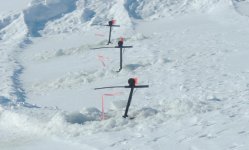 Les trous dans la glace ont étés forés sans difficulté grâce aux tarières à moteur essence. Par contre l’épaisseur de glace était tellement importante que la tarière était à la limite de ses capacités de forage.
