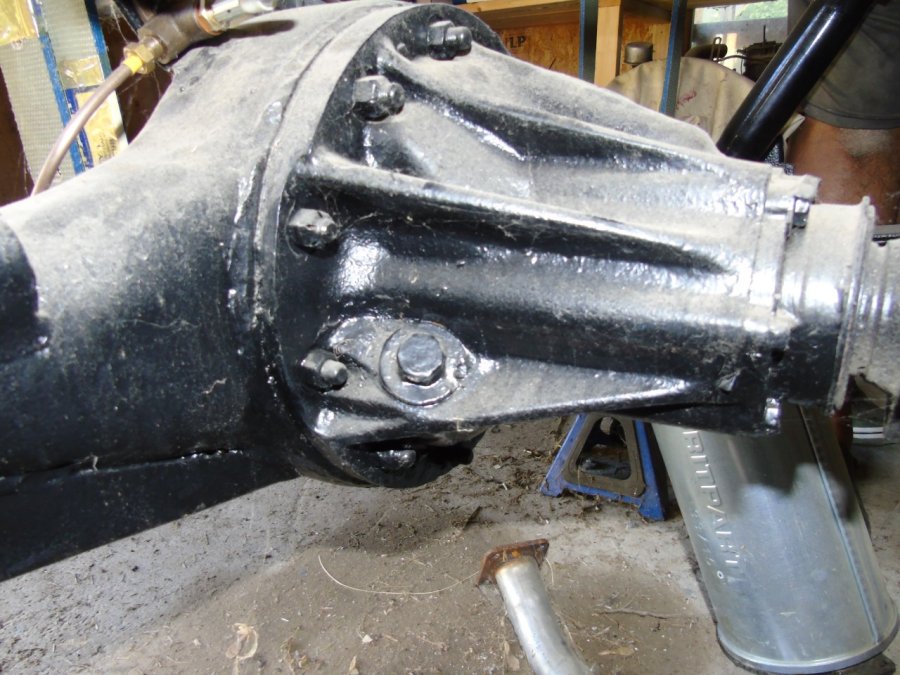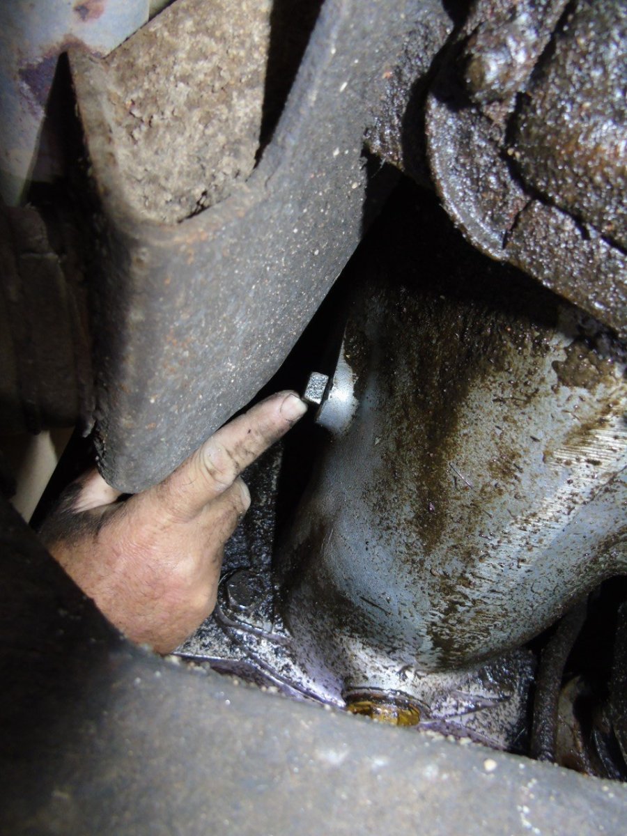 • Il faut se coucher sous le land, à l’aplomb de la portière coté conducteur. On y voit la traverse de la boite de vitesse. Le bouchon de contrôle du niveau se trouve à mi-hauteur sur la boite de vitesse coté moteur de la traverse.